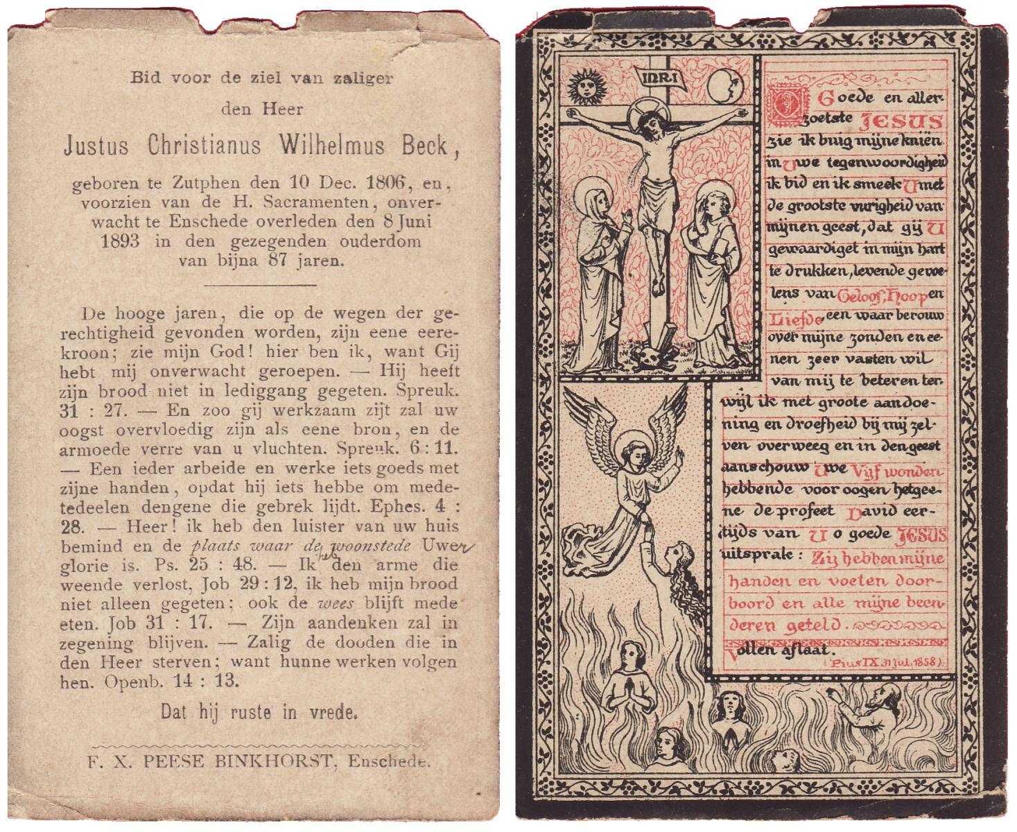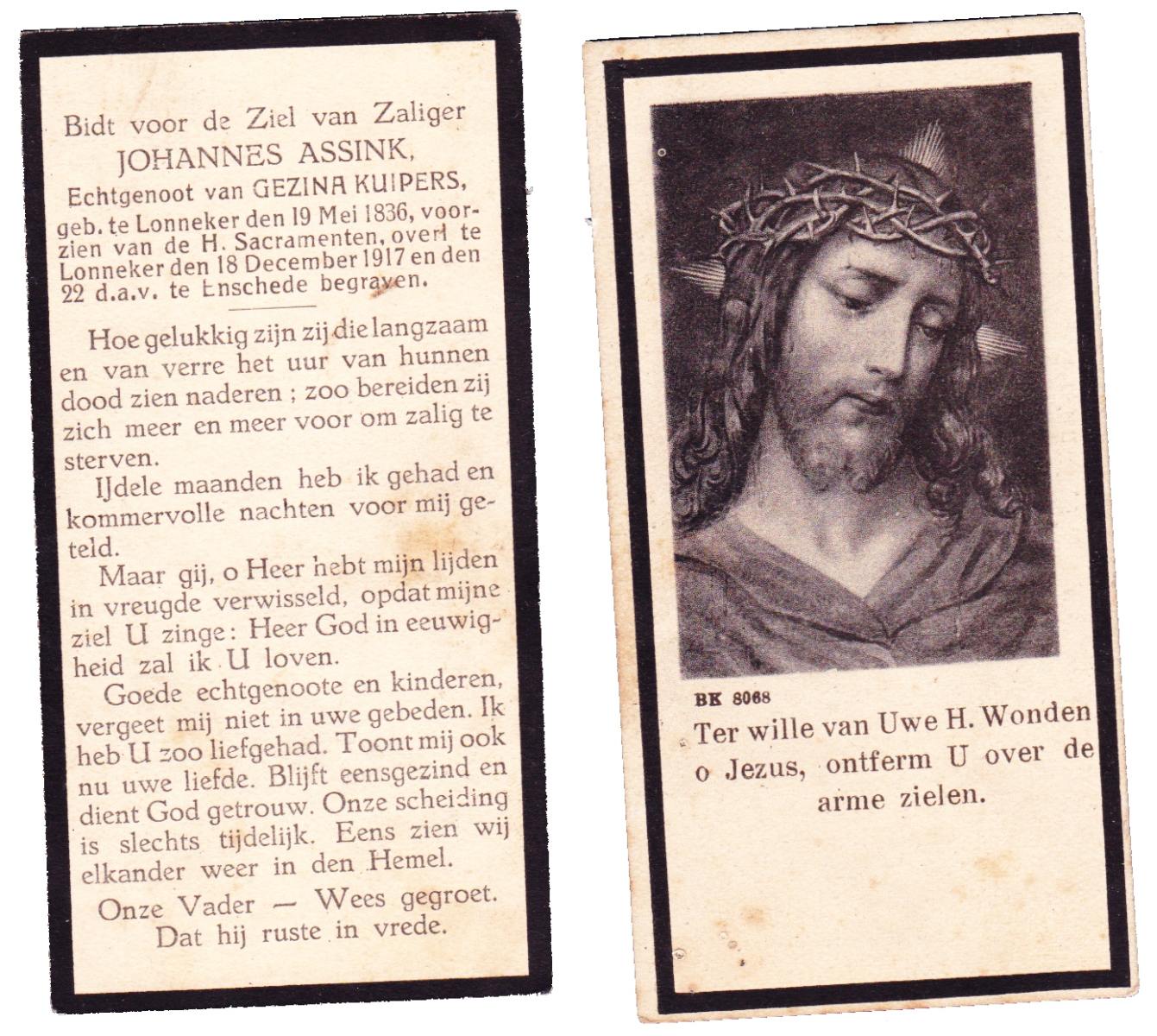 ASSINK, Johannes, geboren op 19-05-1836 te Lonneker, overleden op 18-12-1917 te Lonneker op 81-jarige leeftijd, begraven op 22-12-1917 te Enschede.
