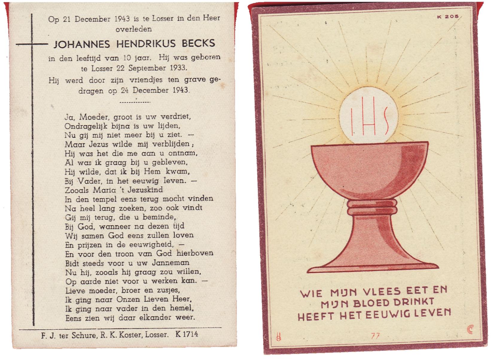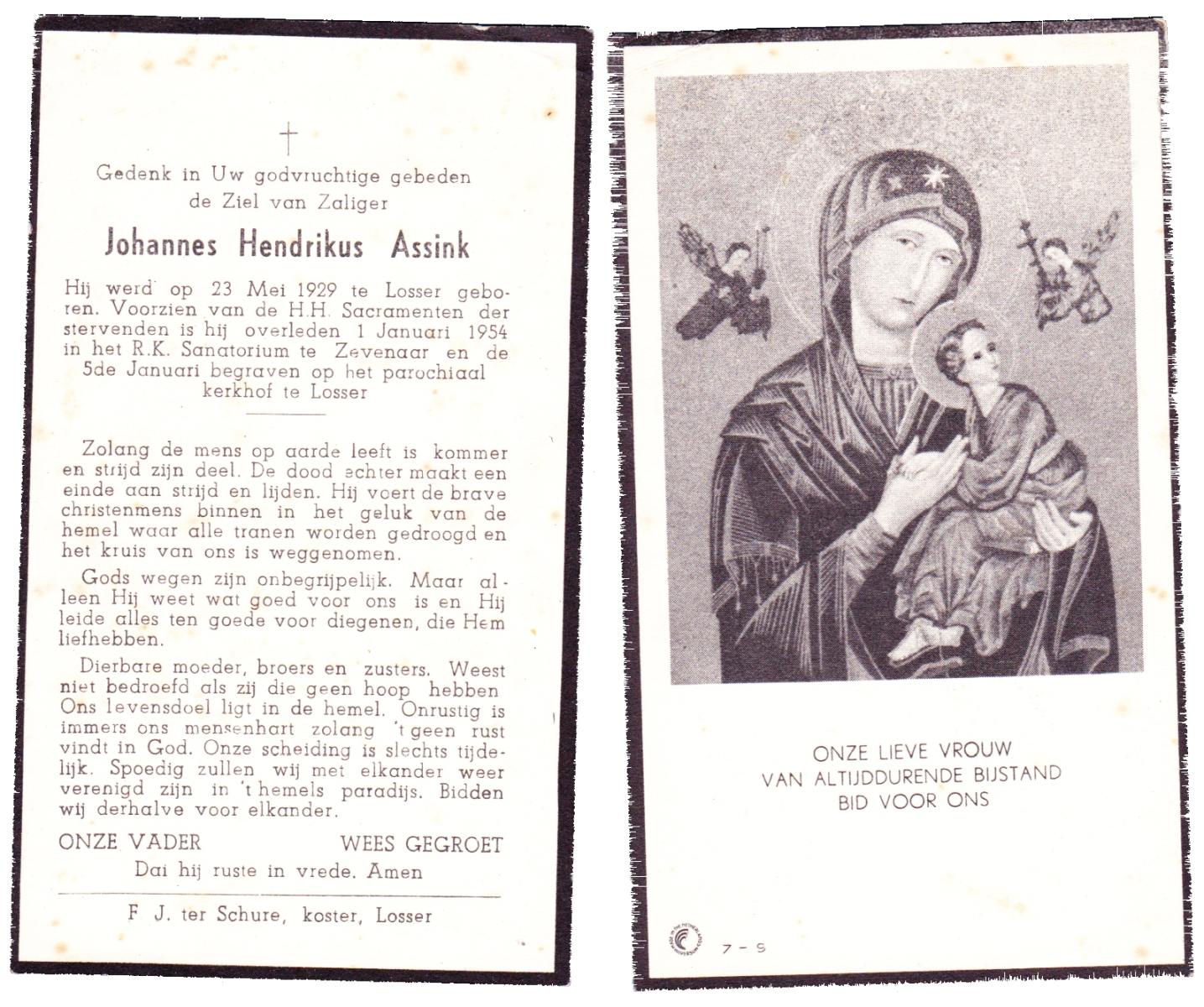 ASSINK, Johannes Hendrikus, geboren op 23-5-1929 te Losser, overleden op 1-1-1954 te Zevenaar op 25-jarige leeftijd, begraven op 5-1-1954 te Losser.