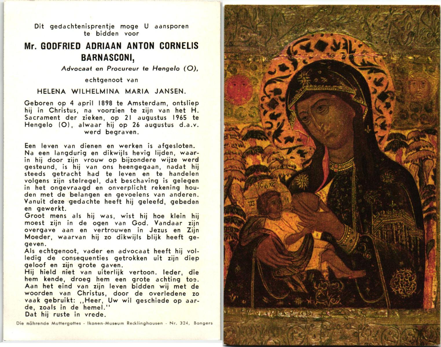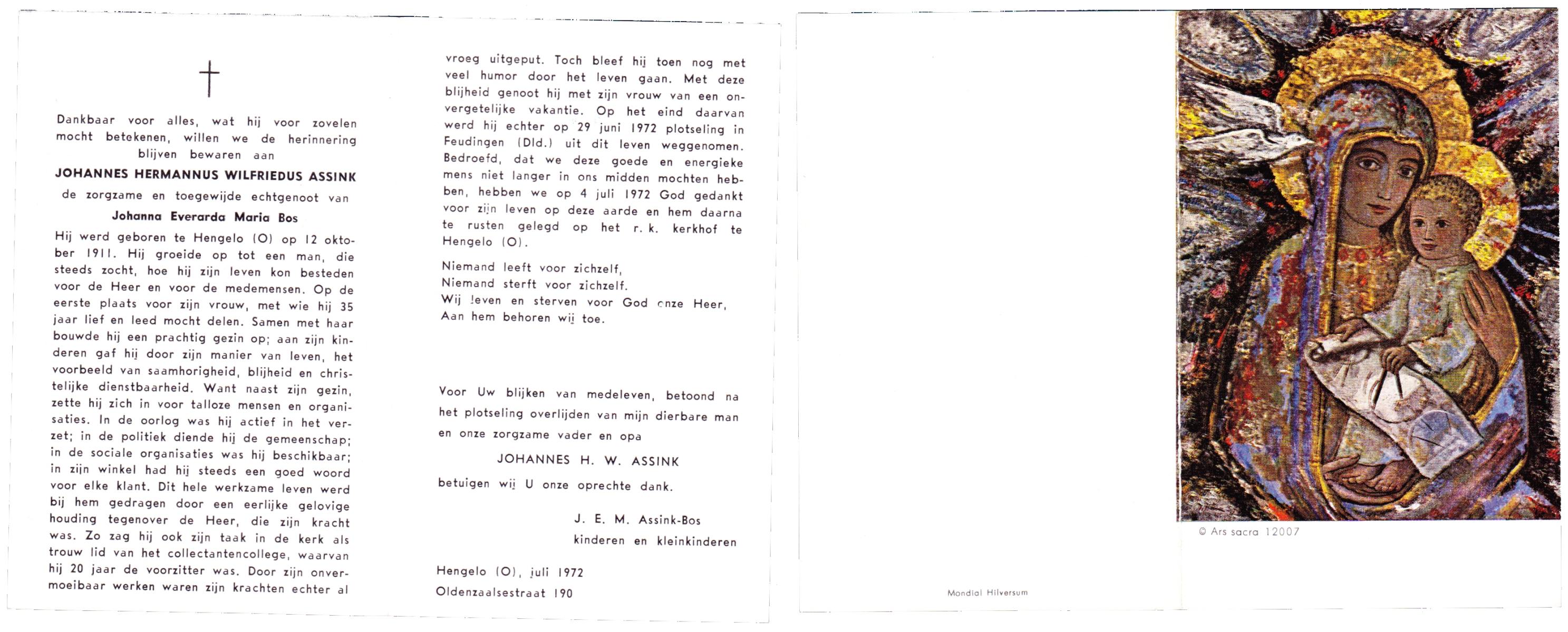 ASSINK, Johannes Hermannus Wilfriedus, geboren op 12-10-1911 te Hengelo (O), overleden op 29-6-1972 te Feudingen(D) op 60-jarige leeftijd, begraven op 4-7-1972 te Hengelo (Ov.).
