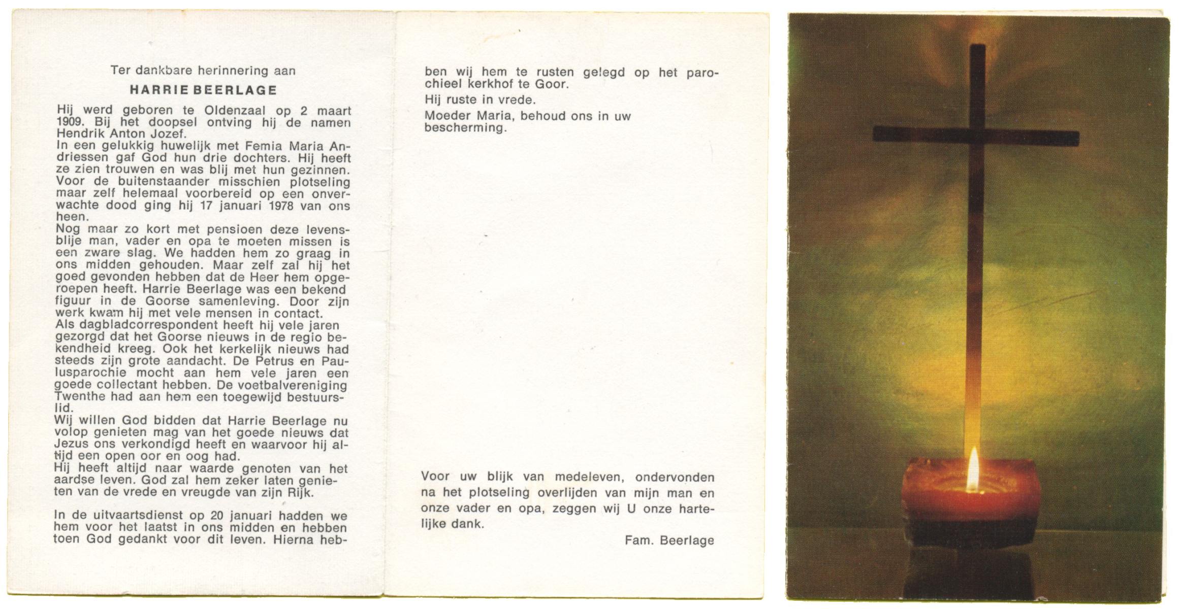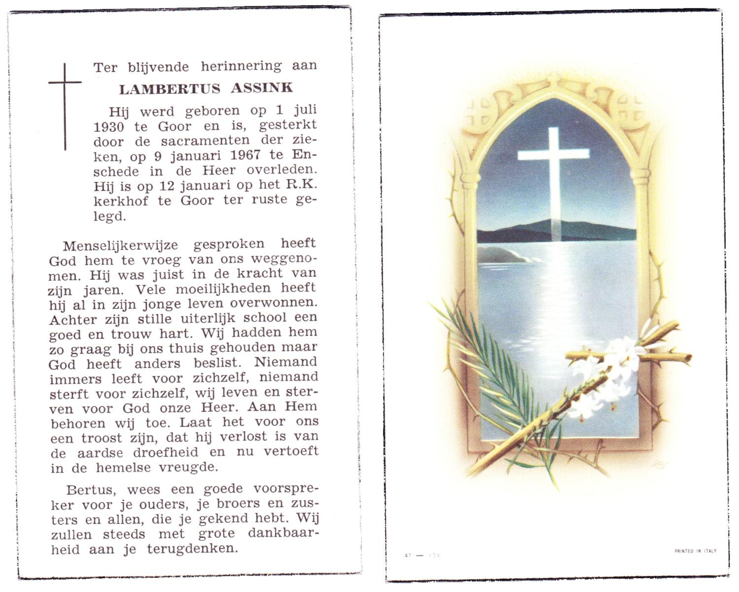 ASSINK, Lambertus, geboren op 1-7-1930 te Goor, overleden op 9-1-1967 te Enschede op 36-jarige leeftijd, begraven op 12-1-1967 te Goor.