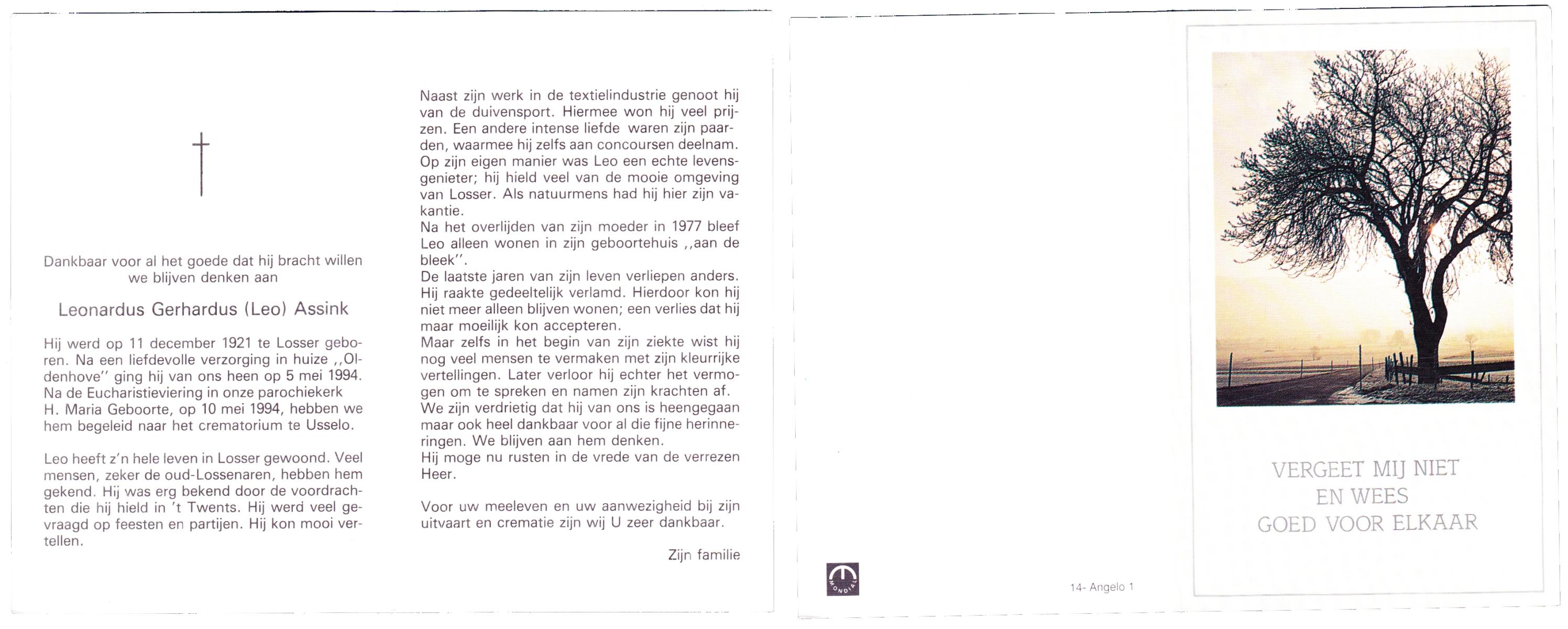 ASSINK, Leonardus Gerhardus, geboren op 11-12-1921 te Losser, overleden op 5-5-1994 te Losser op 72-jarige leeftijd, gecremeerd op 10-5-1994 te Usselo.