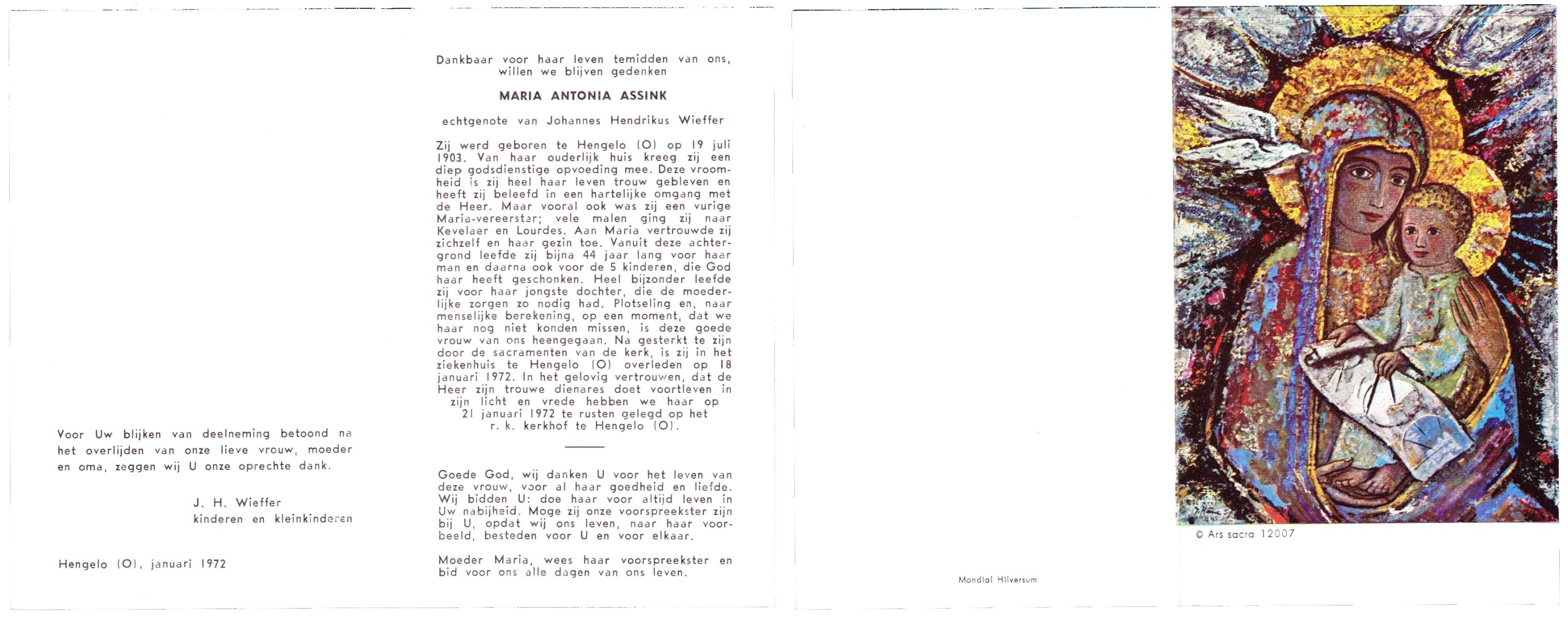 ASSINK, Maria Antonia, geboren op 19-7-1903 te Hengelo (O), overleden op 18-1-1972 te Hengelo (Ov.) op 68-jarige leeftijd, begraven op 21-1-1972 te Hengelo (Ov.).