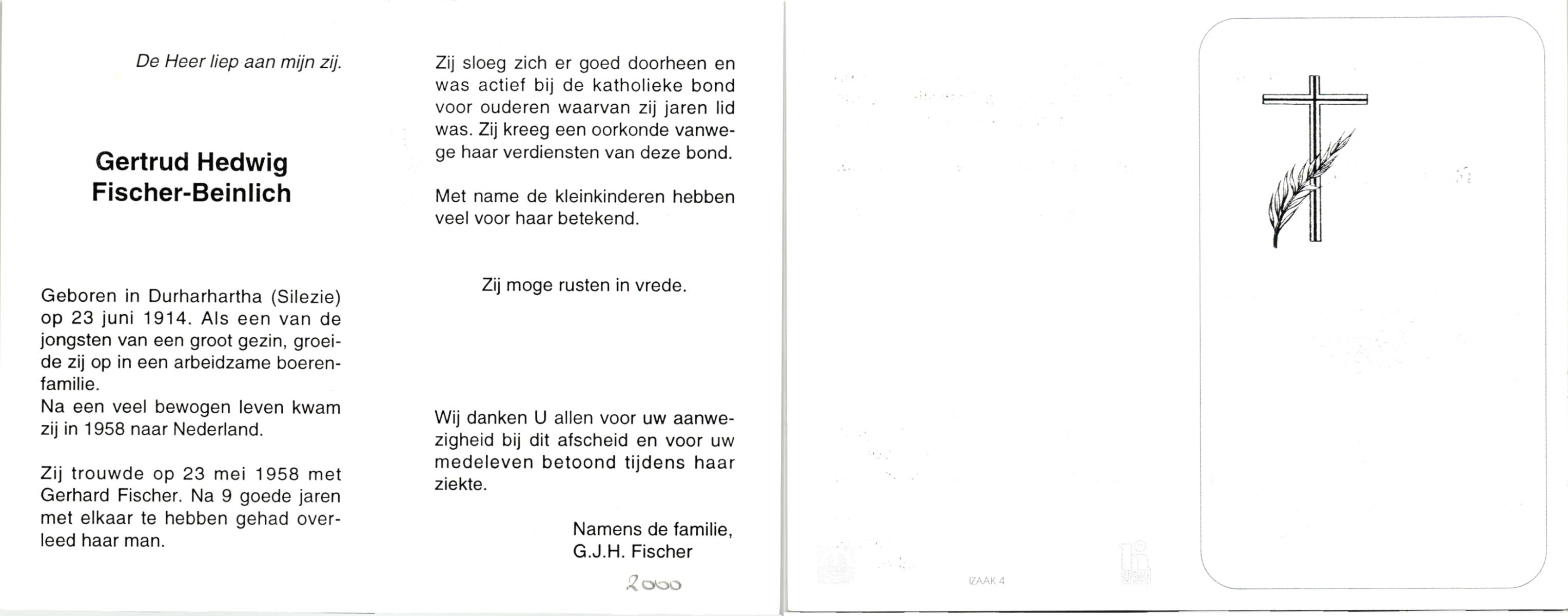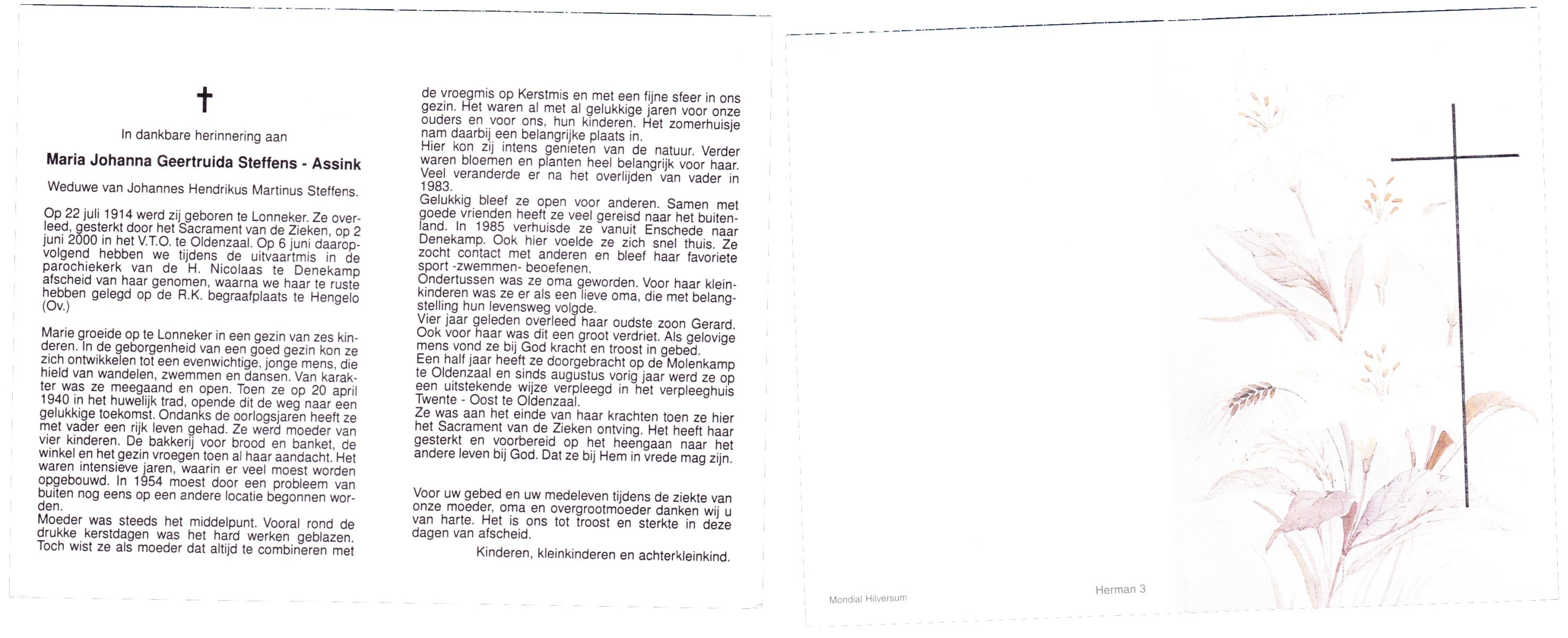ASSINK, Maria Johanna Geertruida, geboren op 22-7-1914 te Lonneker, overleden op 2-6-2000 te Oldenzaal op 85-jarige leeftijd, begraven op 6-6-2000 te Hengelo (Ov.).
