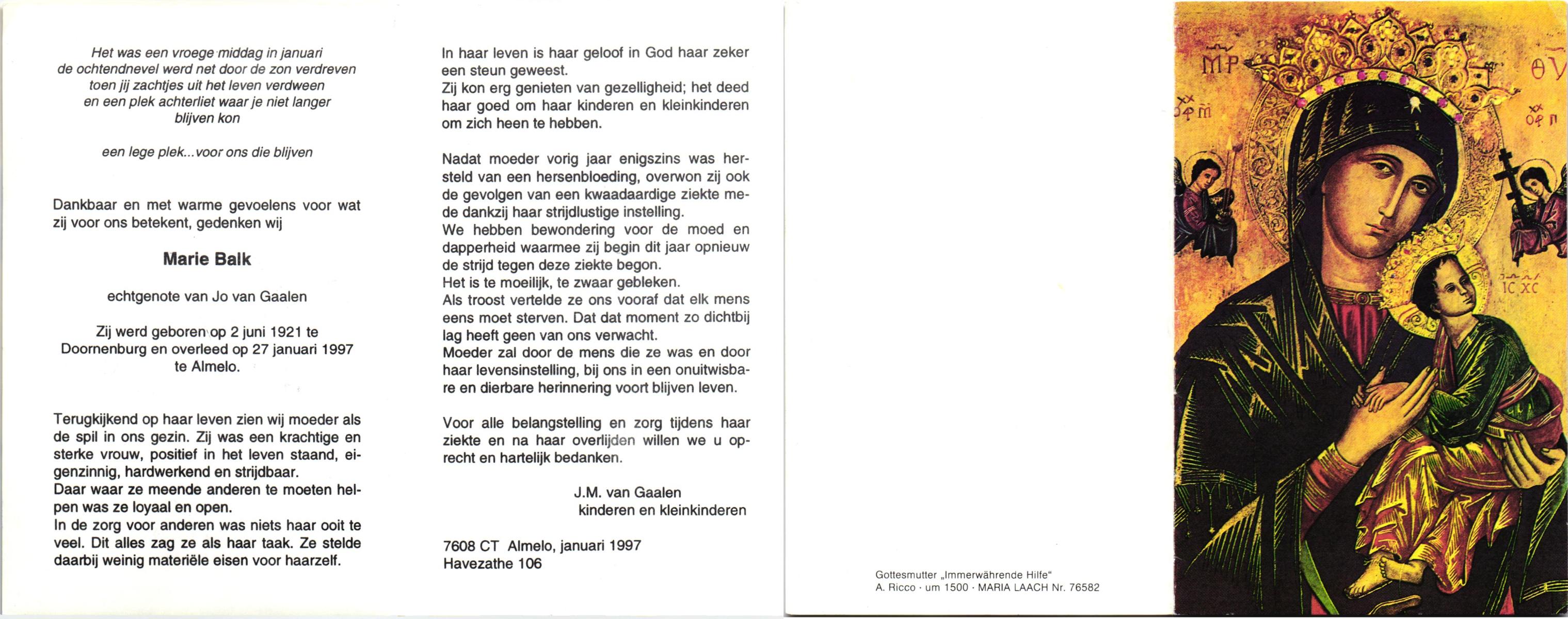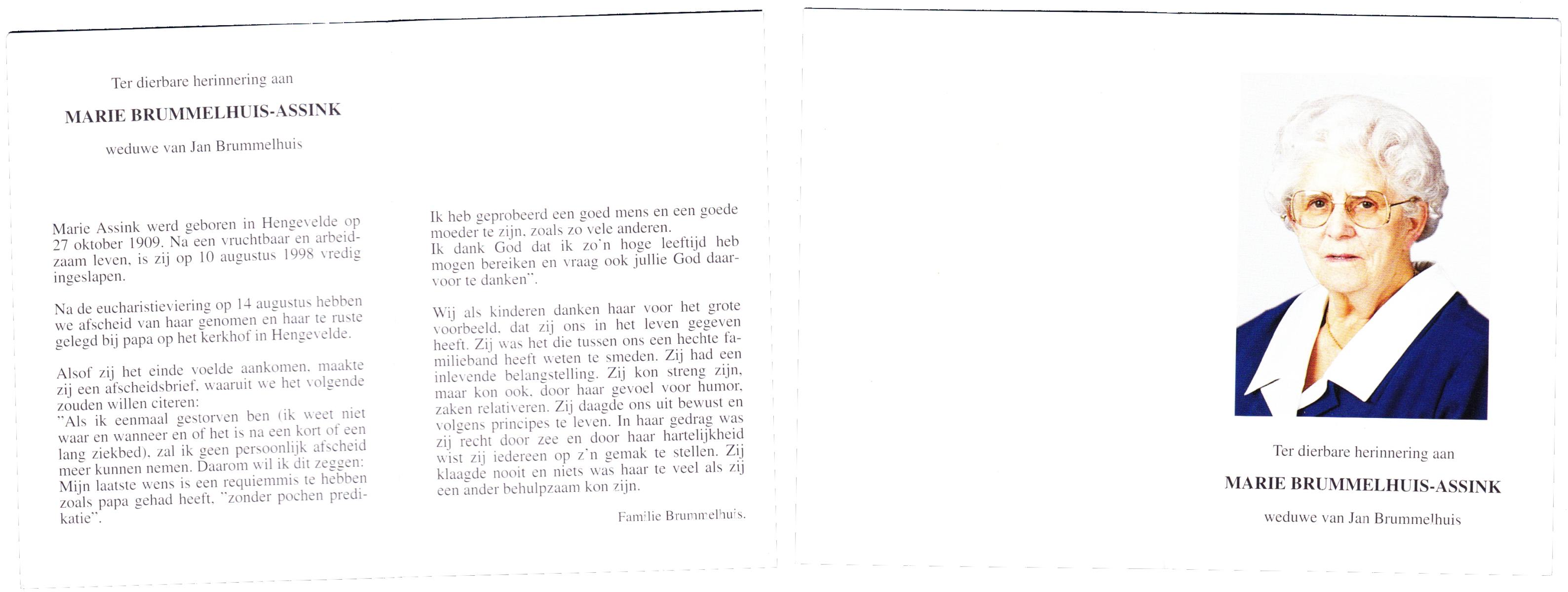 ASSINK, Marie, geboren op 27-10-1909 te Hengevelde, overleden op 10-8-1998 op 88-jarige leeftijd, begraven op 14-8-1998 te Hengevelde.