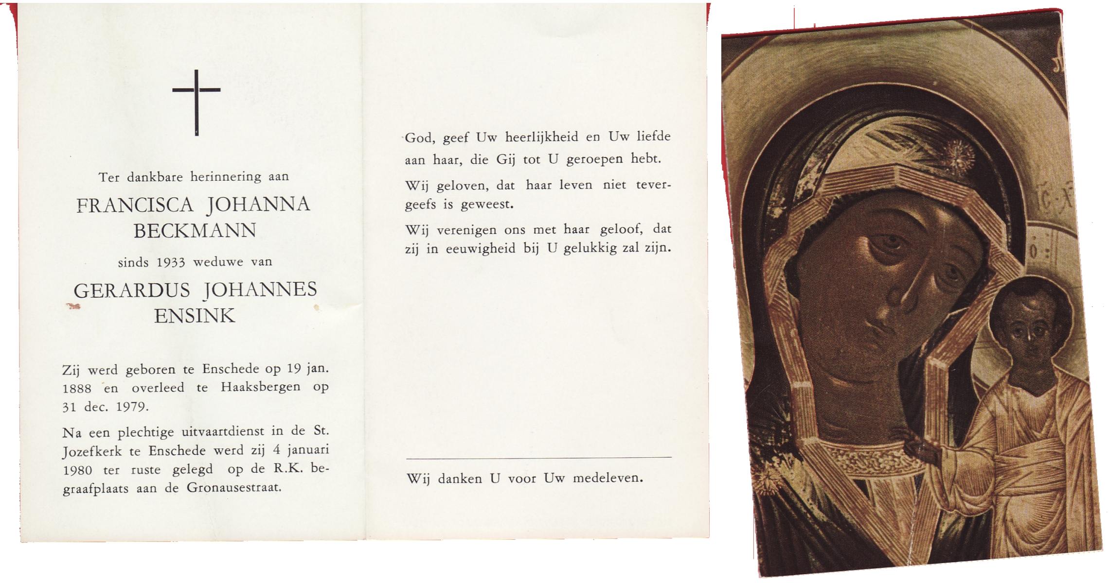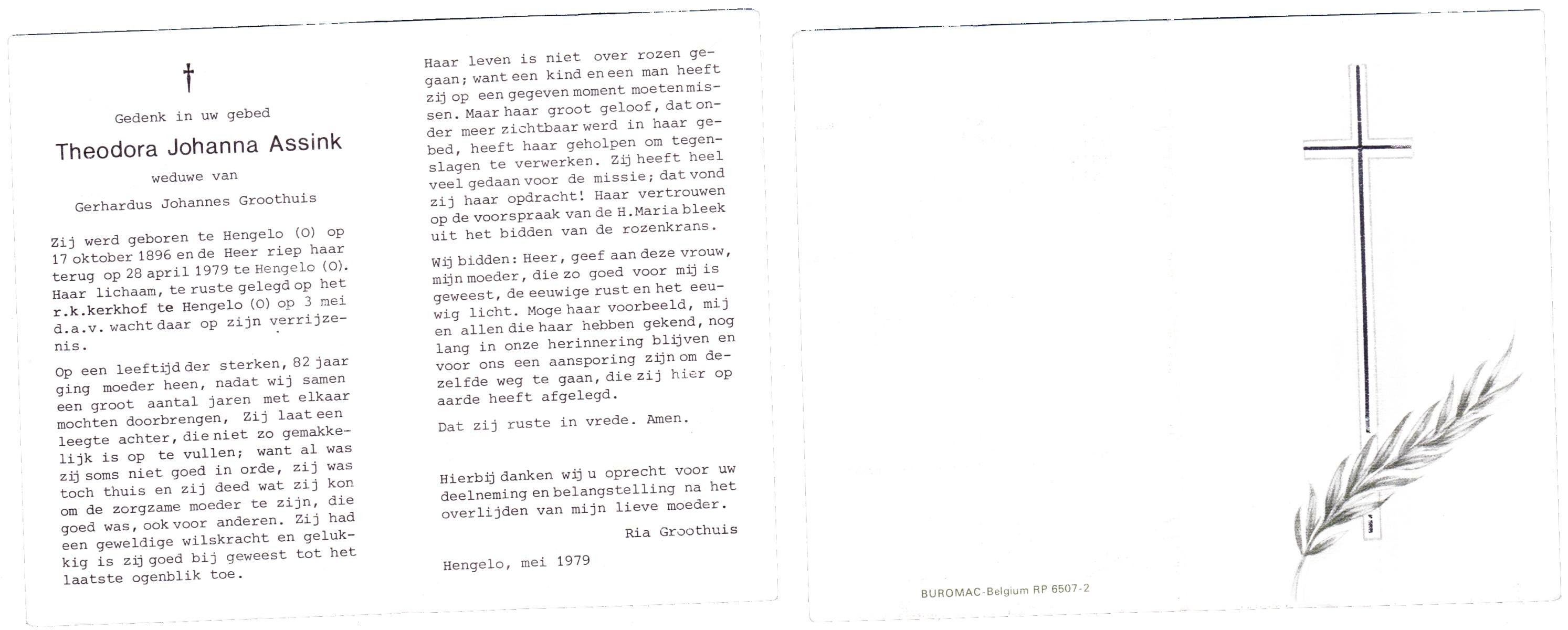 ASSINK, Theodora Johanna, geboren op 17-10-1896 te Hengelo (O), overleden op 28-4-1979 te Hengelo (Ov.) op 82-jarige leeftijd, begraven op 3-5-1979 te Hengelo (Ov.).