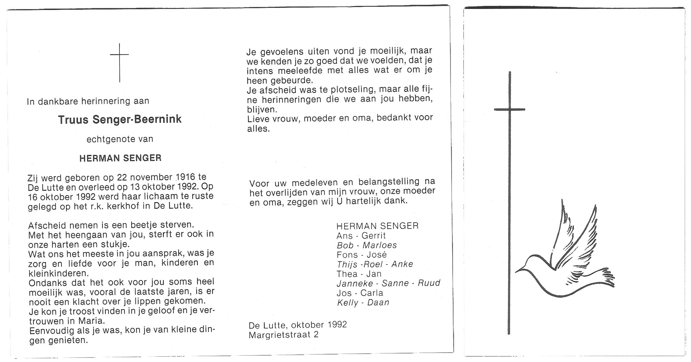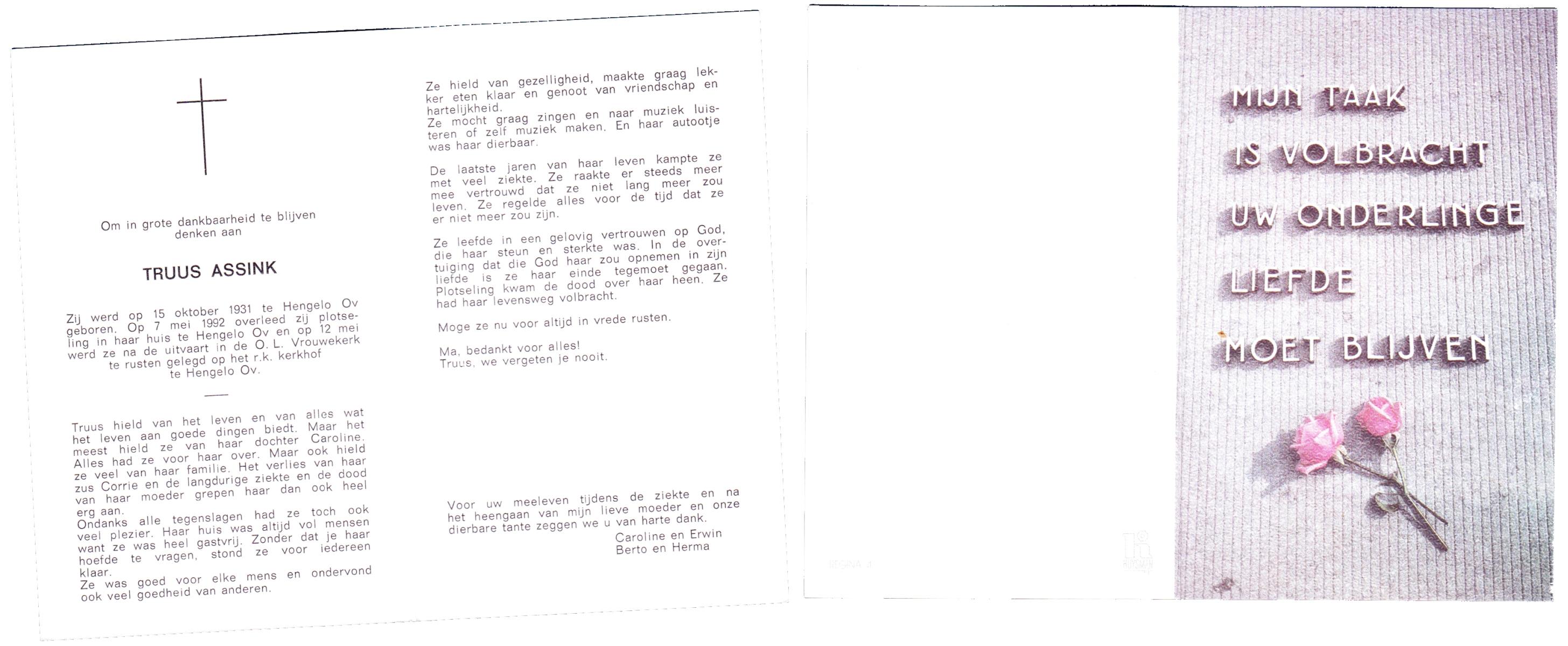 ASSINK, Truus, geboren op 15-10-1931 te Hengelo (O), overleden op 7-5-1992 te Hengelo (Ov.) op 60-jarige leeftijd, begraven op 12-5-1992 te Hengelo (Ov.).