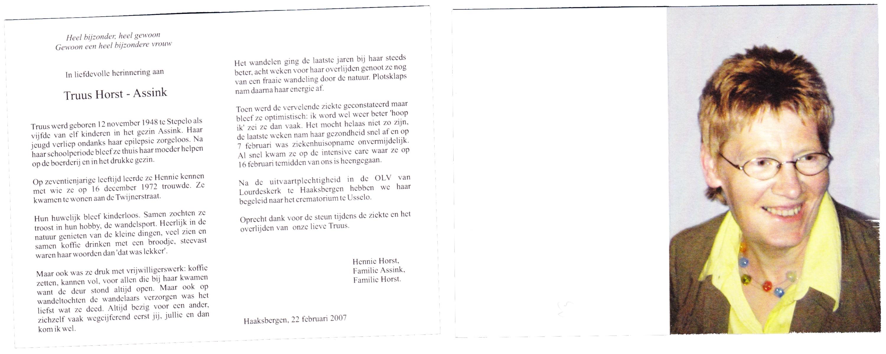 ASSINK, Truus, geboren op 12-11-1948 te Stepelo, overleden op 16-2-2007 te Haaksbergen op 58-jarige leeftijd, gecremeerd te Usselo.