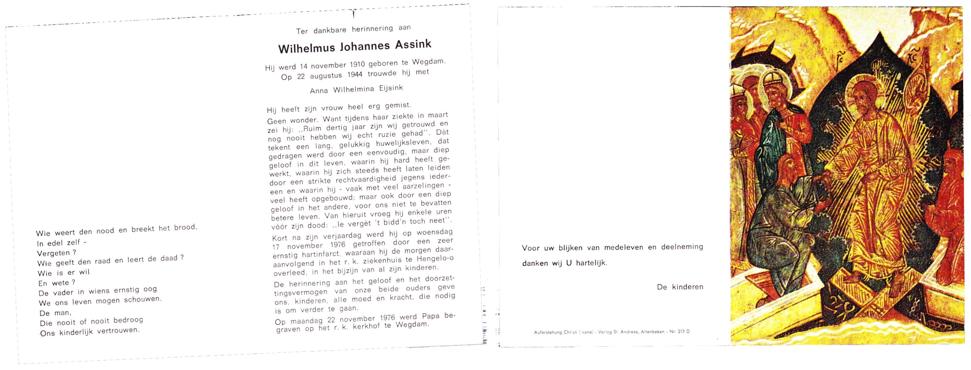 ASSINK, Wilhelmus Johannes, geboren op 14-11-1910 te Wegdam, overleden op 18-11-1976 te Hengelo (Ov.) op 66-jarige leeftijd, begraven op 22-11-1976 te Wegdam.
