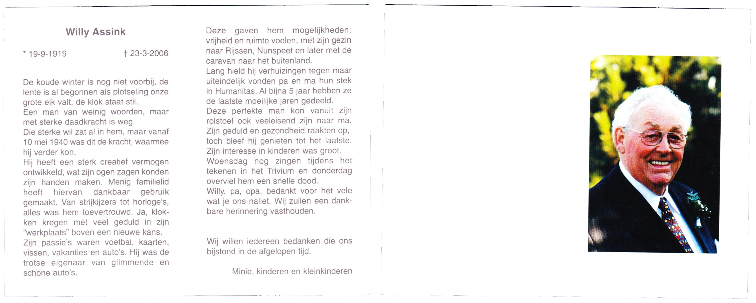 ASSINK, Willy, geboren op 19-9-1919, overleden op 23-3-2006 op 86-jarige leeftijd.