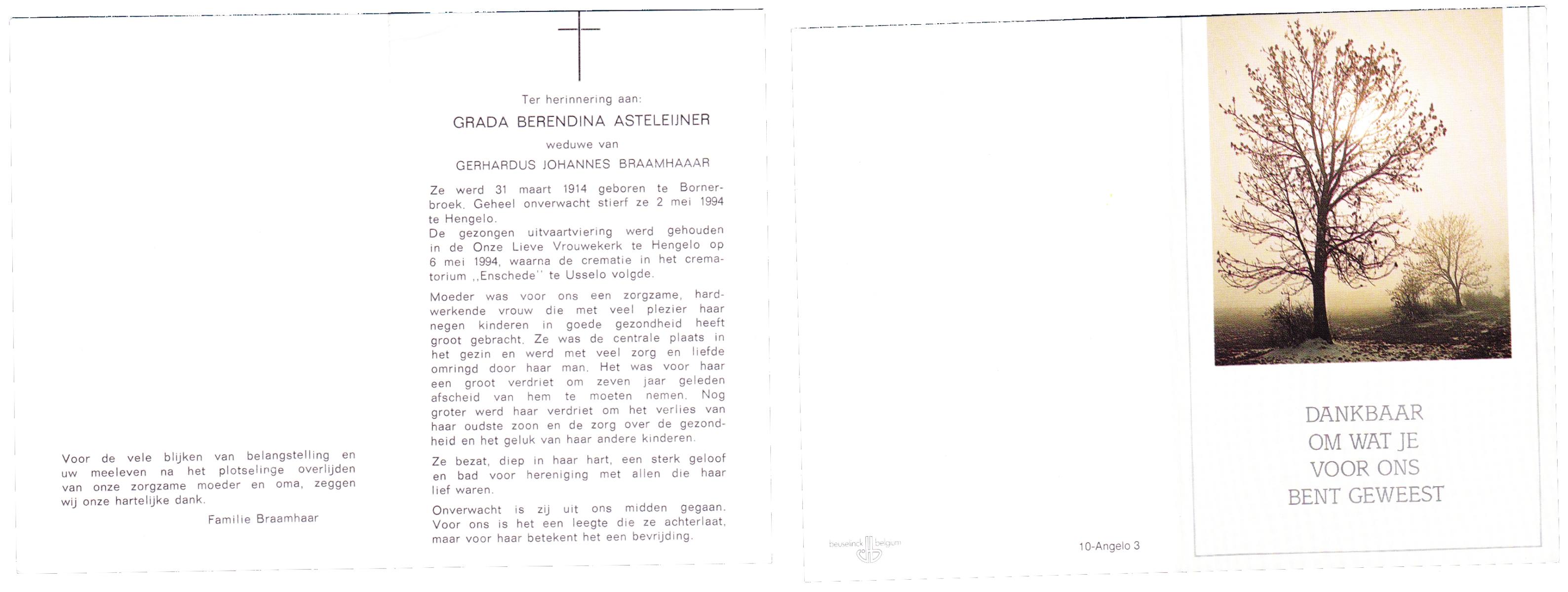 ASTELEIJNER, Grada Berendina, geboren op 31-3-1914 te Bornerbroek, overleden op 2-5-1994 te Hengelo (Ov.) op 80-jarige leeftijd, gecremeerd op 6-5-1994 te Usselo.
