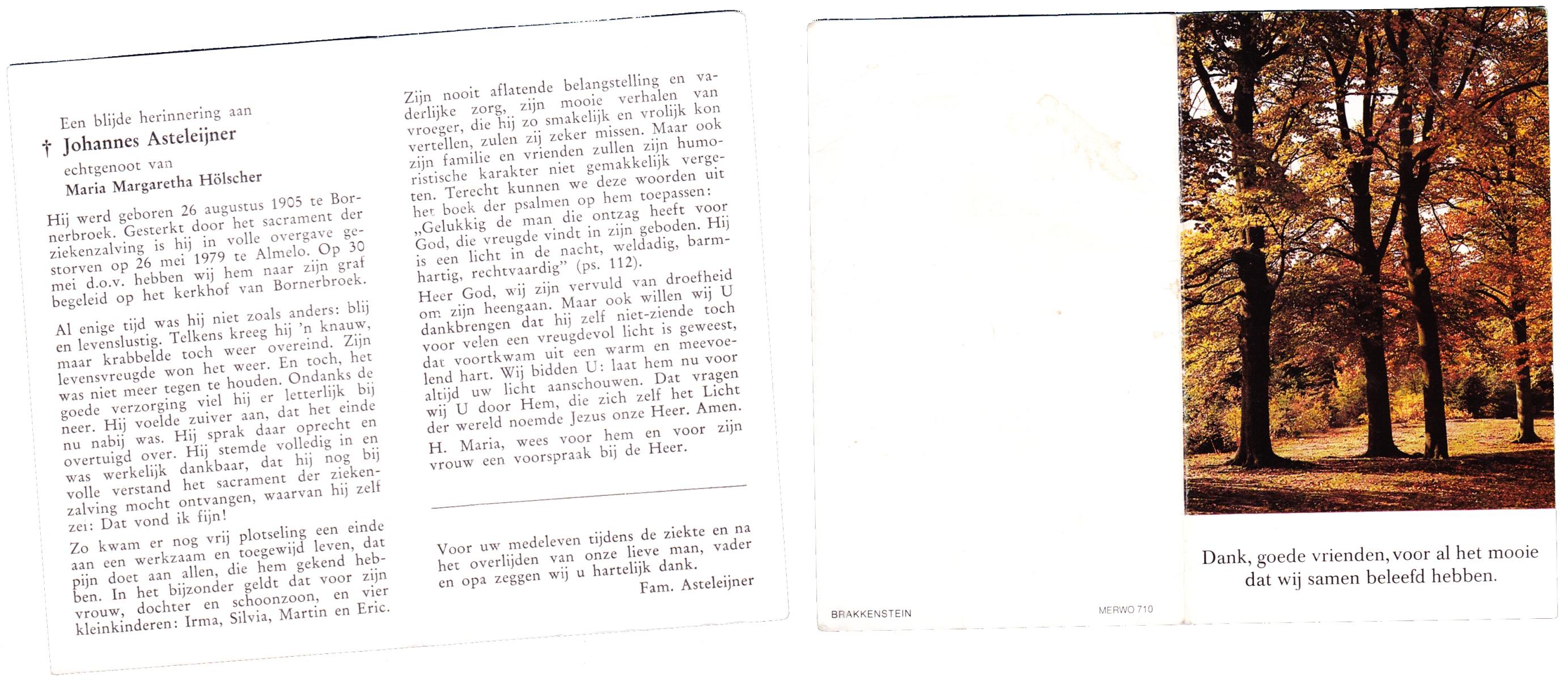 ASTELEIJNER, Johannes, geboren op 26-8-1905 te Bornerbroek, overleden op 26-5-1979 te Almelo op 73-jarige leeftijd, begraven op 30-5-1979 te Bornerbroek.