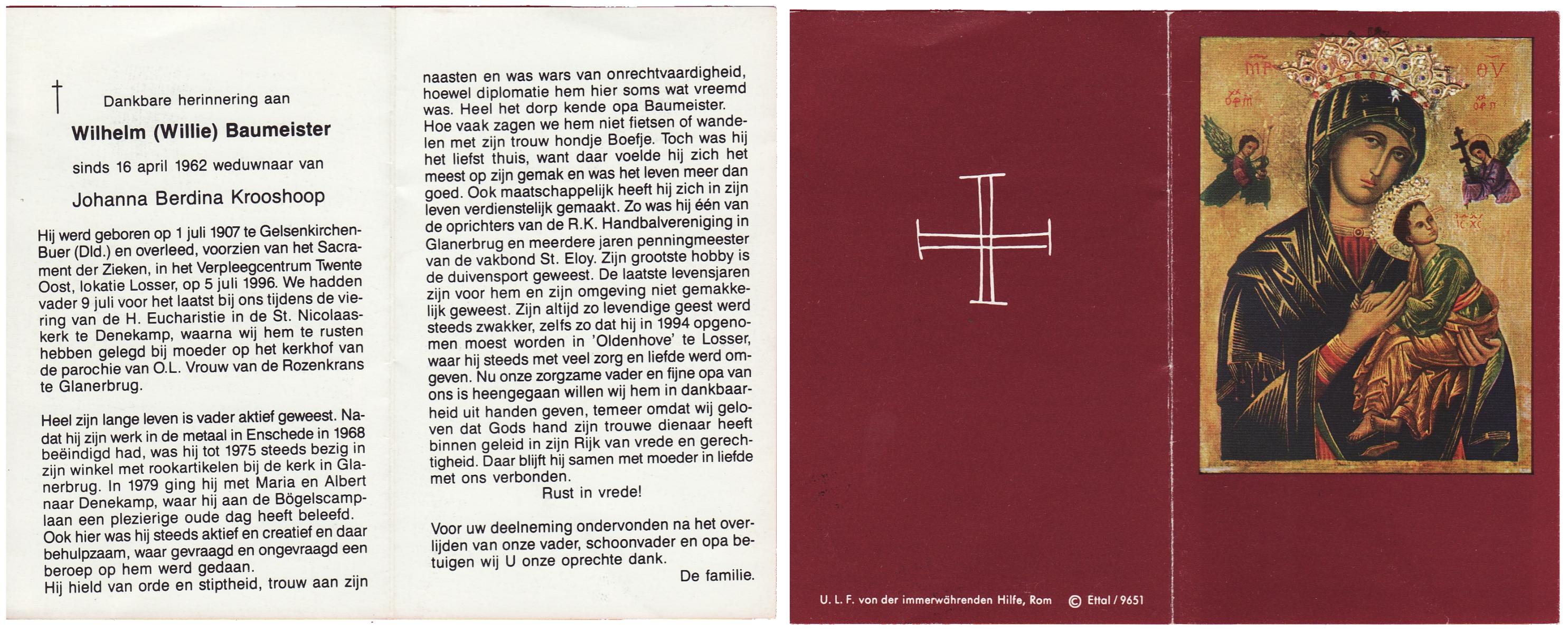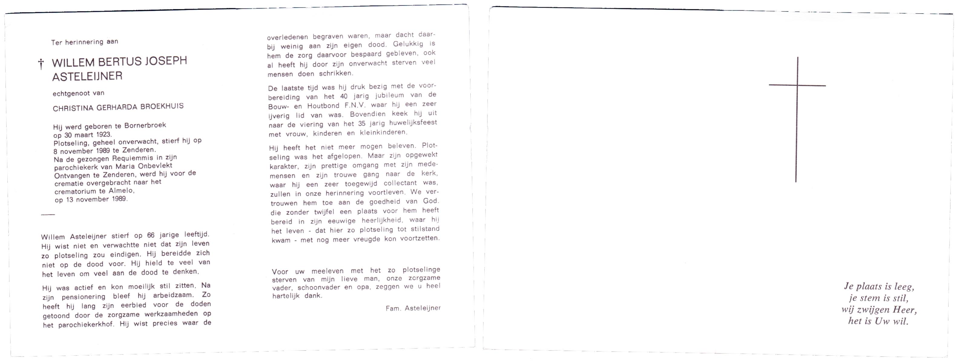 ASTELEIJNER, Willem Bertus Joseph, geboren op 30-3-1923 te Bornerbroek, overleden op 8-11-1989 te Zenderen op 66-jarige leeftijd, gecremeerd op 13-11-1989 te Almelo.