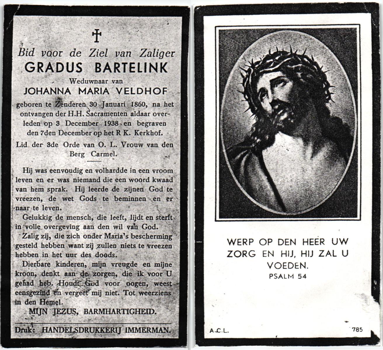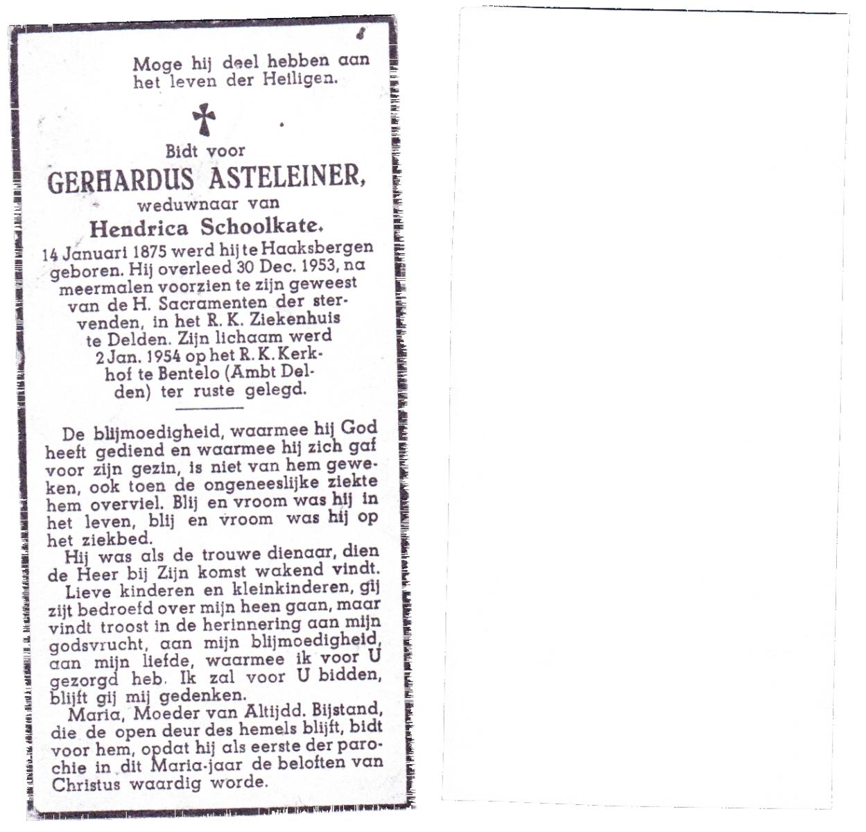 ASTELEINER, Gerhardus, geboren op 14-01-1875 te Haaksbergen, overleden op 30-12-1953 te Delden op 78-jarige leeftijd, begraven op 2-1-1954 te Bentelo.