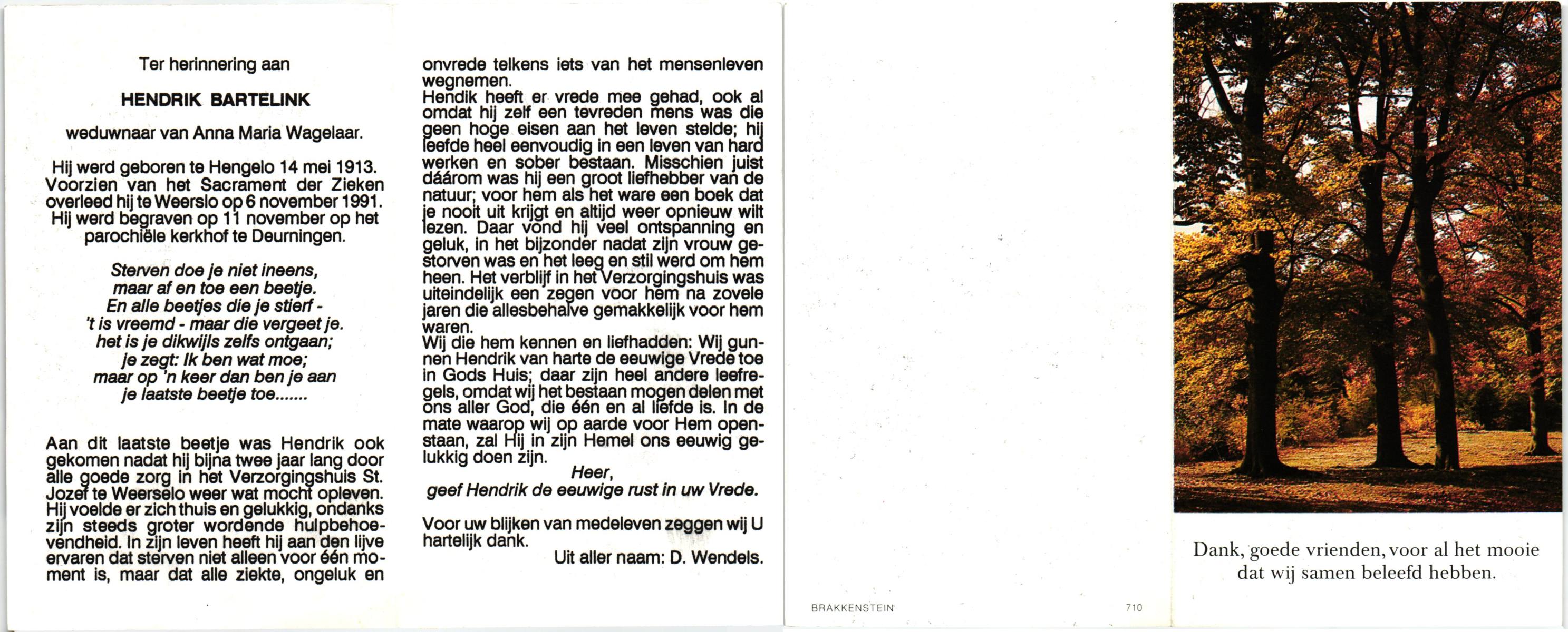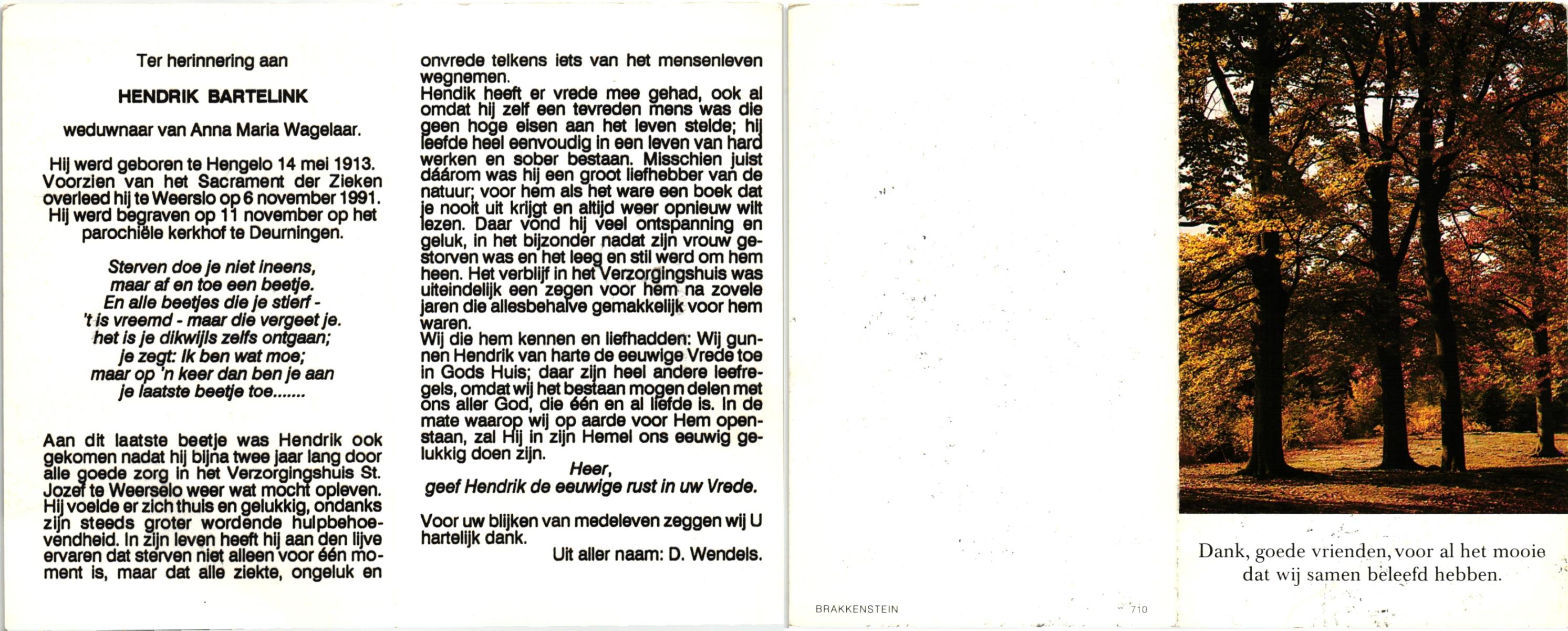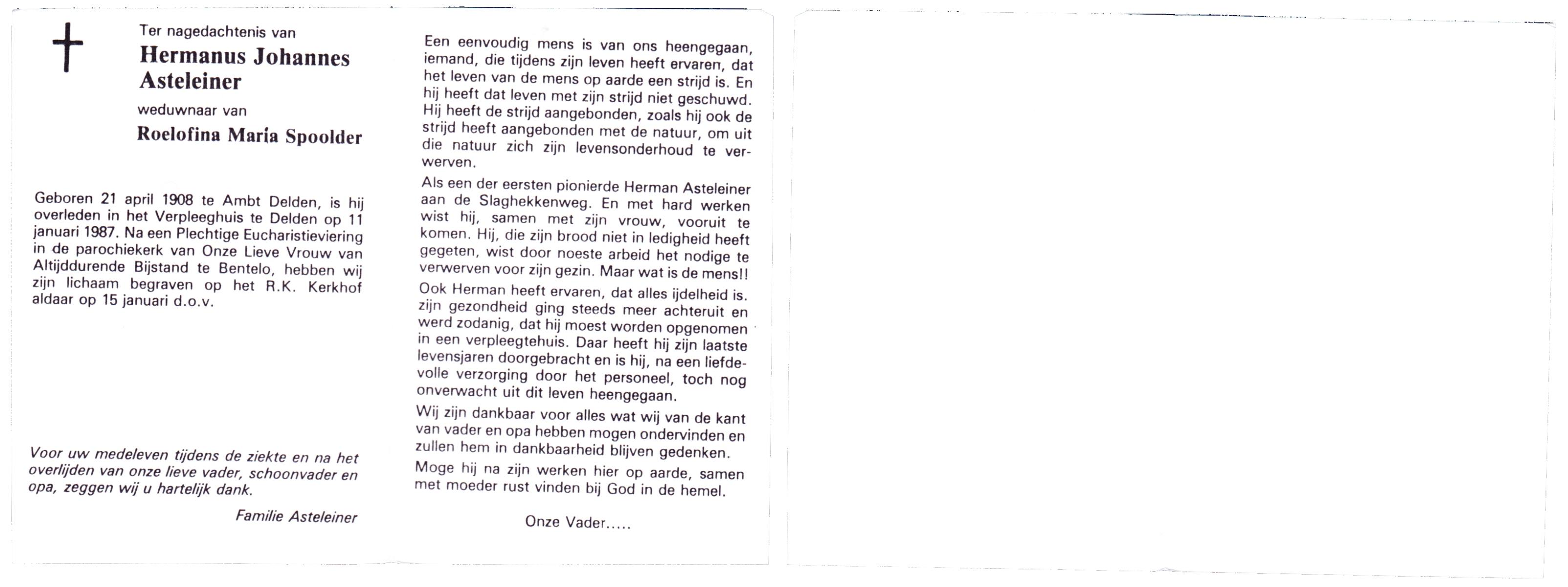 ASTELEINER, Hermanus Johannes, geboren op 21-4-1908 te Delden, Ambt, overleden op 11-1-1987 te Delden op 78-jarige leeftijd, begraven op 15-1-1987 te Bentelo, Delden.