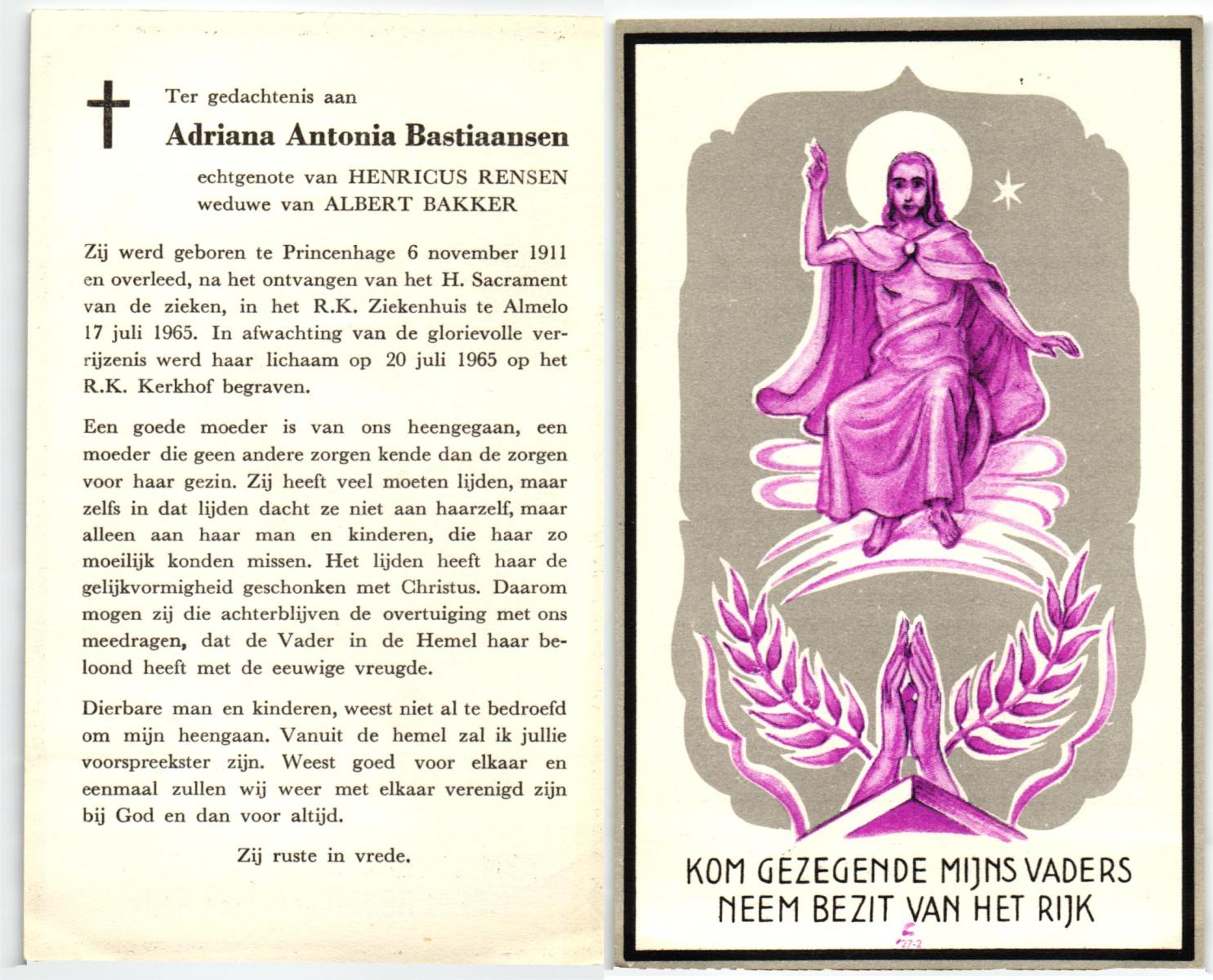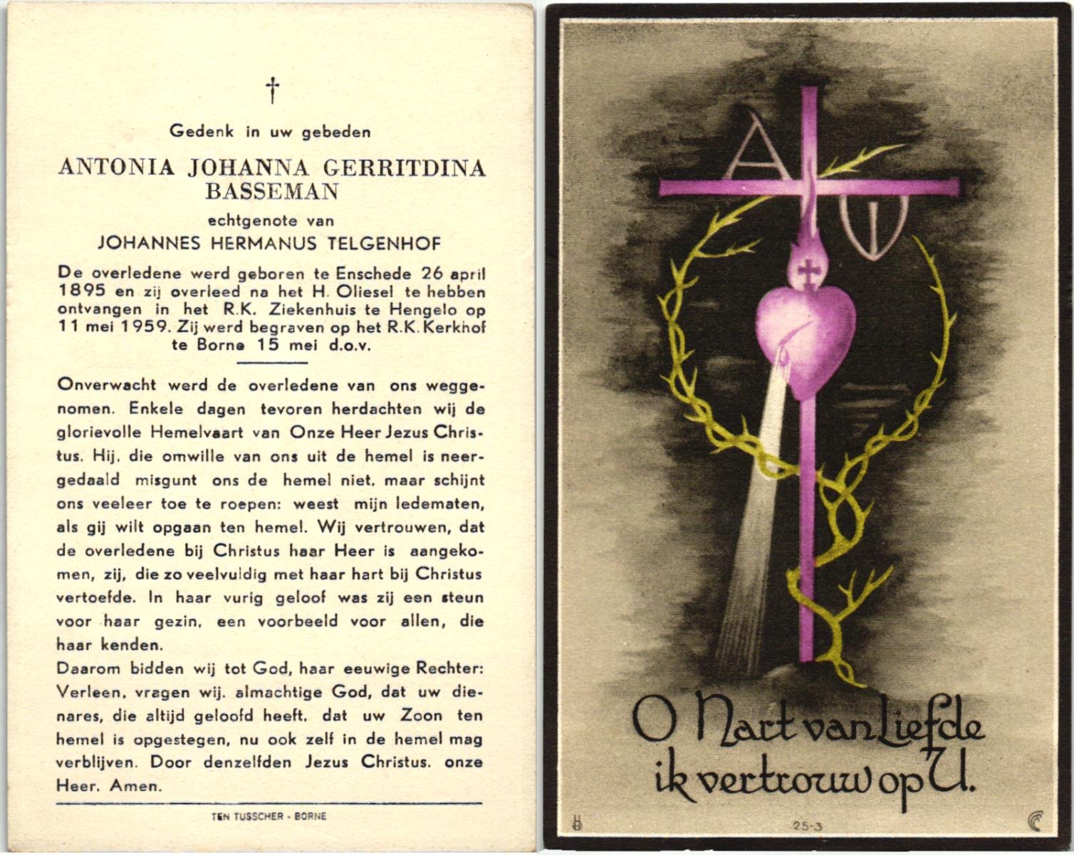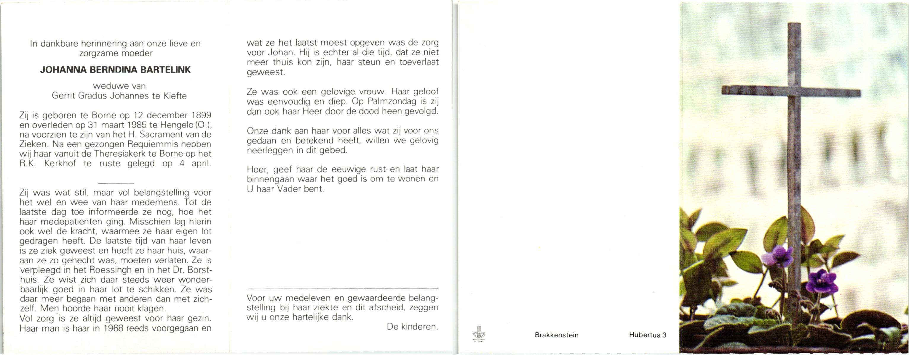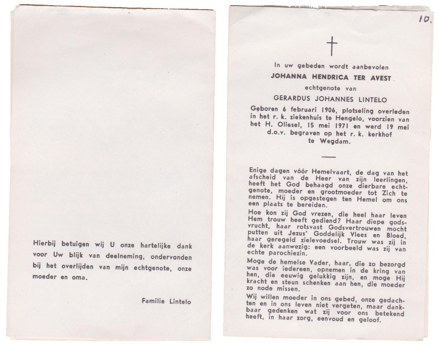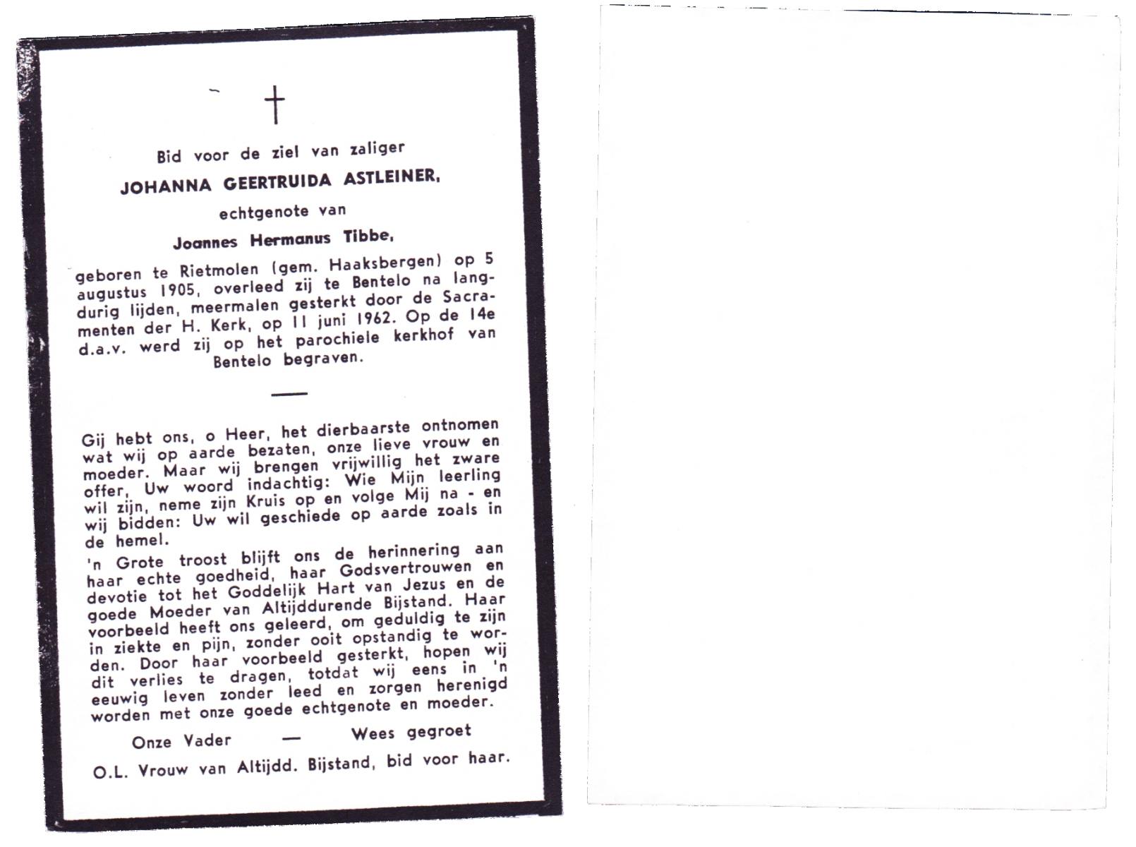 ASTELEINER, Johanna Geertruida, geboren op 5-8-1905 te Rietmolen, overleden op 11-6-1962 te Bentelo op 56-jarige leeftijd, begraven op 14-6-1962 te Bentelo.