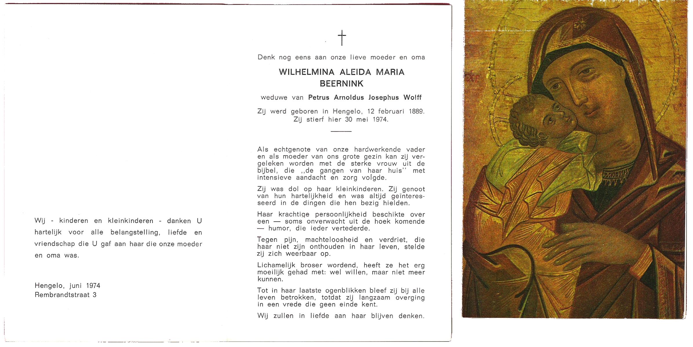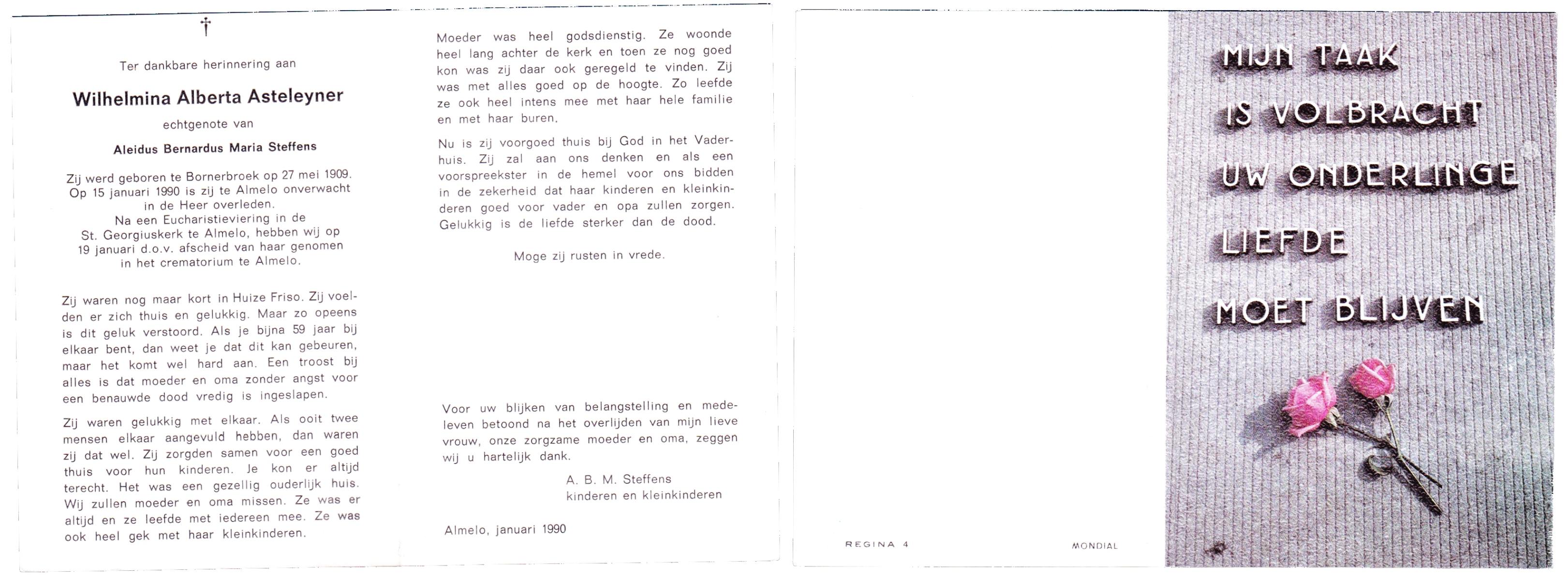 ASTELEYNER, Wilhelmina Alberta, geboren op 27-5-1909 te Bornerbroek, overleden op 15-1-1990 te Almelo op 80-jarige leeftijd, gecremeerd op 19-1-1990 te Almelo.