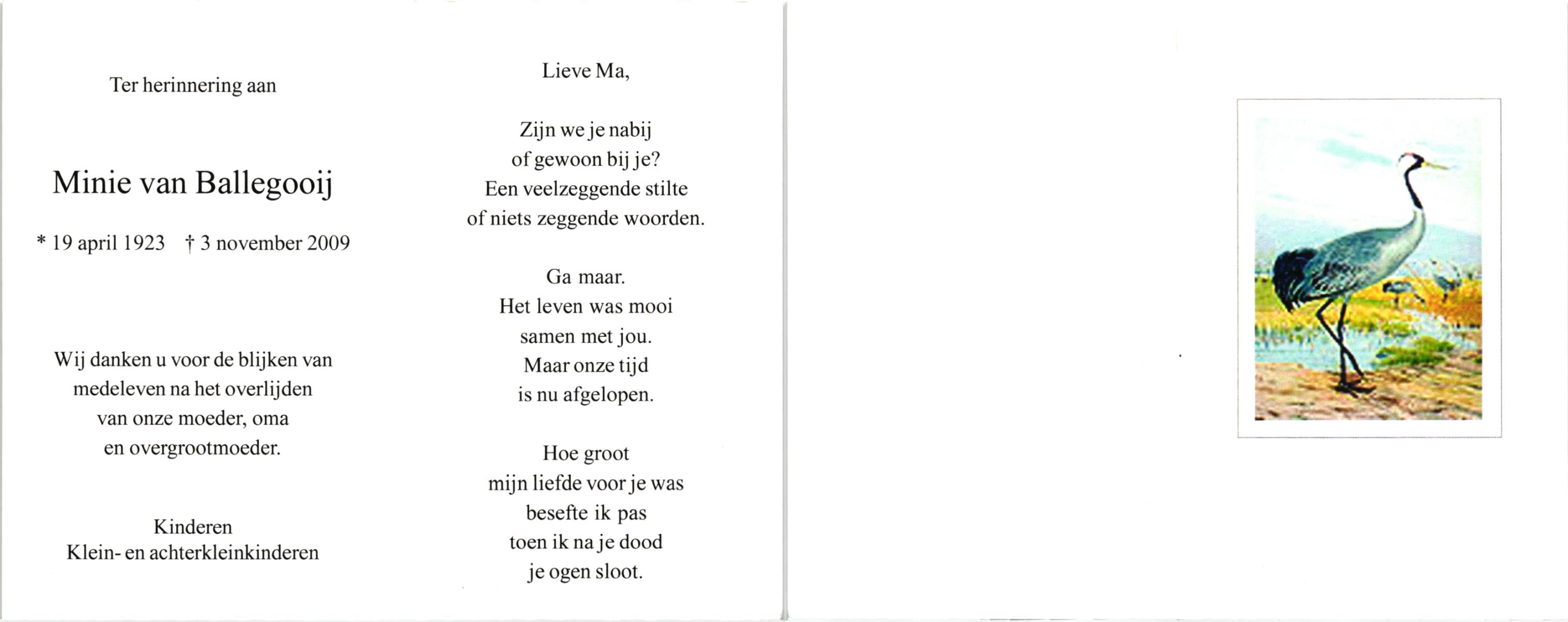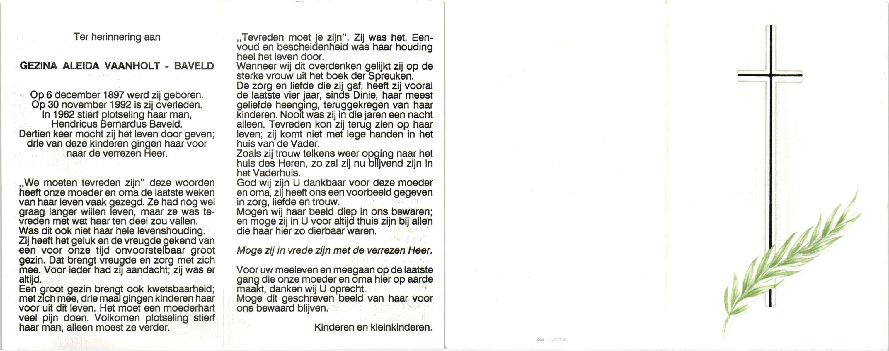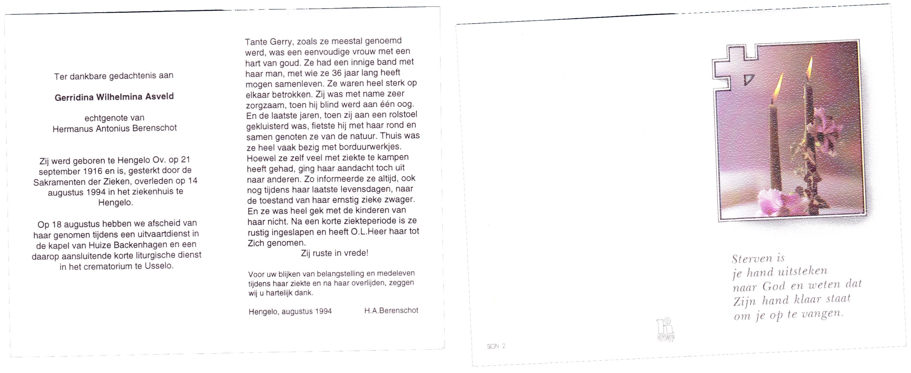 ASVELD, Gerridina Wilhelmina, geboren op 21-9-1916 te Hengelo (O), overleden op 14-8-1994 te Hengelo (Ov.) op 77-jarige leeftijd, gecremeerd op 18-8-1994 te Usselo.