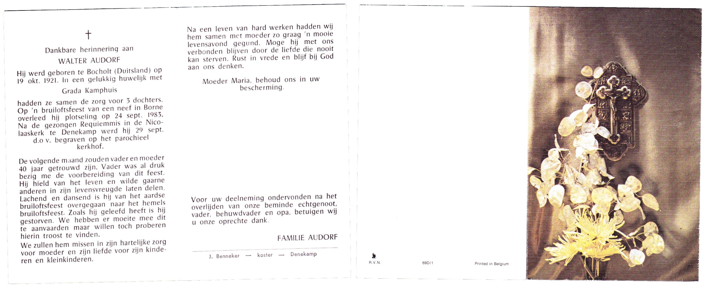AUDORF, Walter, geboren op 19-10-1921 te Bocholt (Dld), overleden op 24-9-1983 te Borne op 62-jarige leeftijd, begraven op 29-9-1983 te Denekamp.