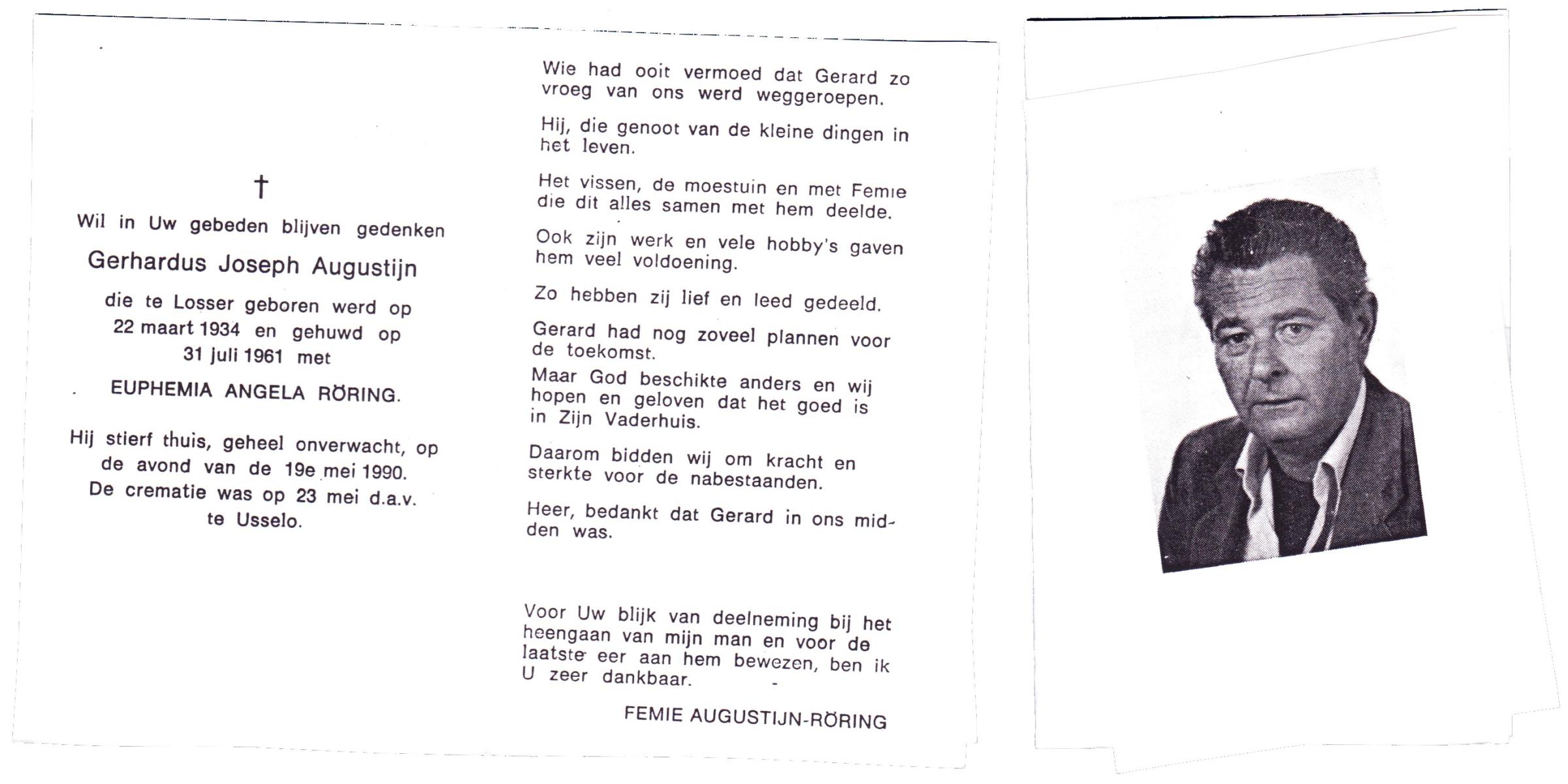 AUGUSTIJN, Gerhardus Joseph, geboren op 22-3-1934 te Losser, overleden op 19-5-1990 op 56-jarige leeftijd, gecremeerd op 23-5-1990 te Usselo.