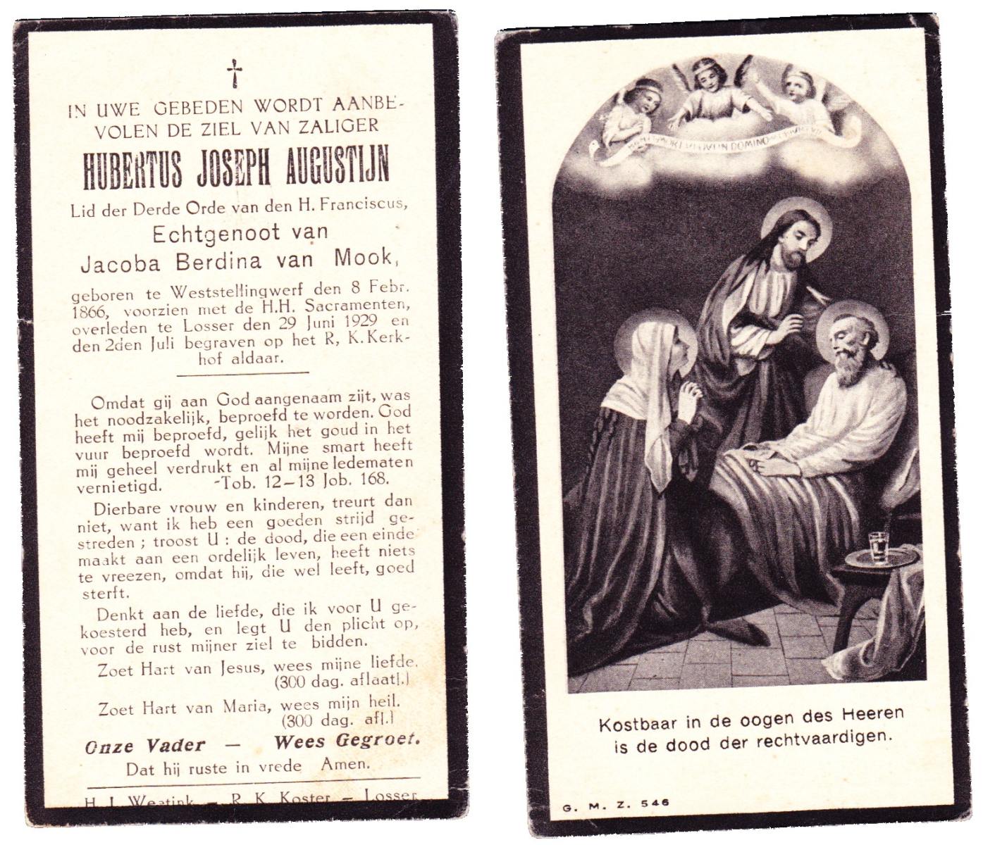 AUGUSTIJN, Hubertus Joseph, geboren op 08-02-1866 te Weststellingwerf, overleden op 29-6-1929 te Losser op 63-jarige leeftijd, begraven op 2-7-1929 te Losser.