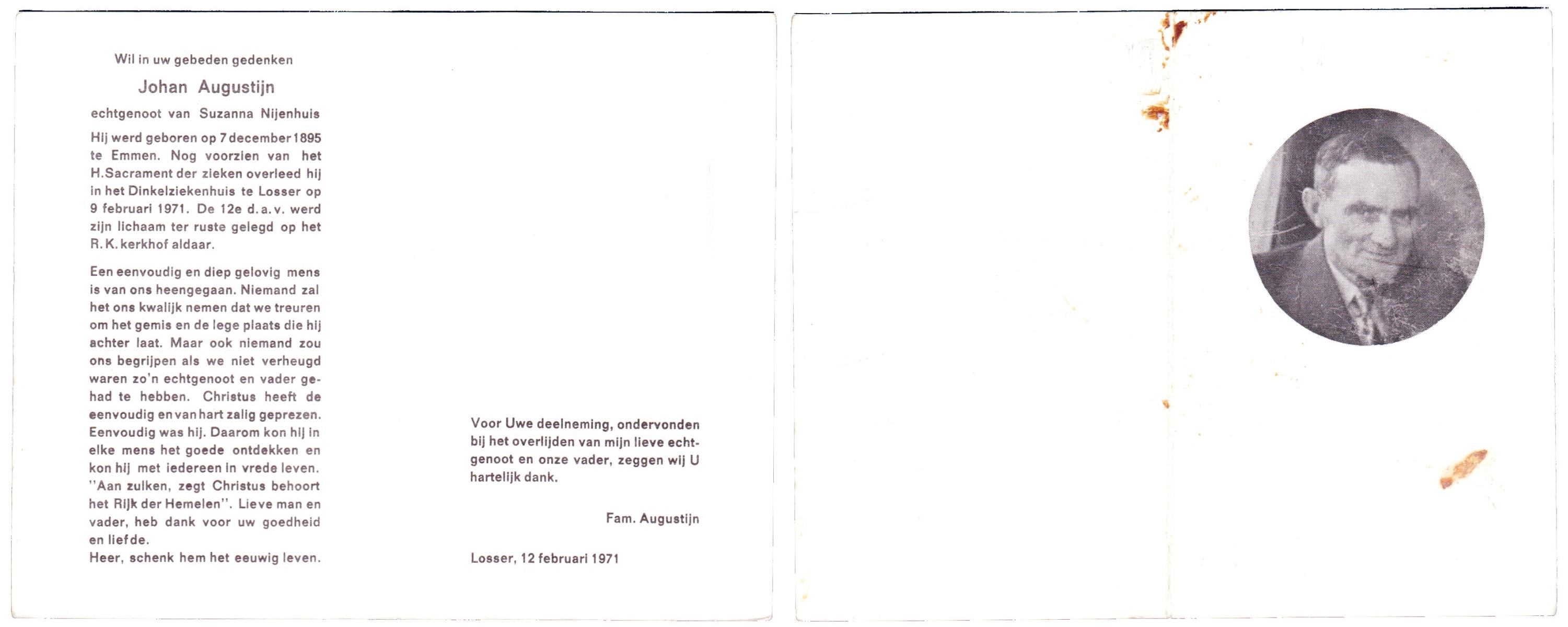 AUGUSTIJN, Johan, geboren op 07-12-1895 te Emmen, overleden op 9-2-1971 te Losser op 75-jarige leeftijd, begraven op 12-2-1971 te Losser.