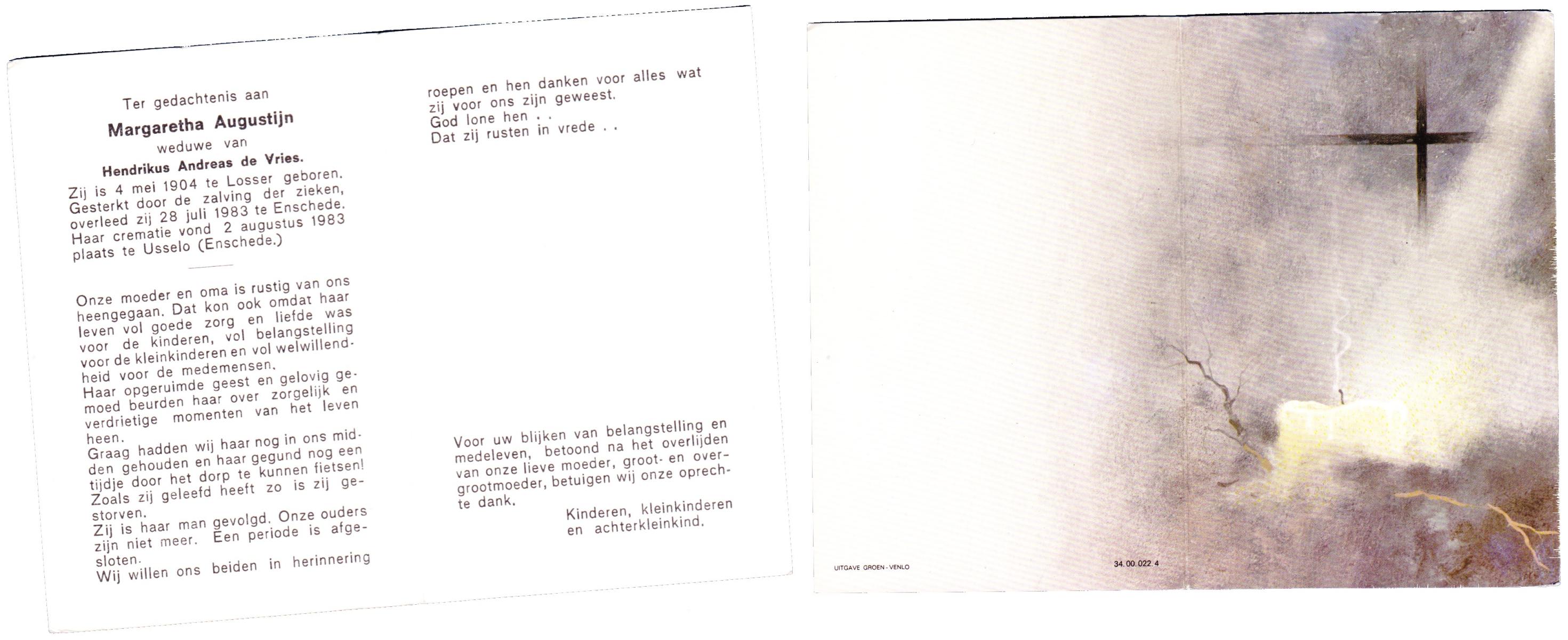 AUGUSTIJN, Margaretha, geboren op 4-5-1904 te Losser, overleden op 28-7-1983 te Enschede op 79-jarige leeftijd, gecremeerd op 2-8-1983 te Usselo.