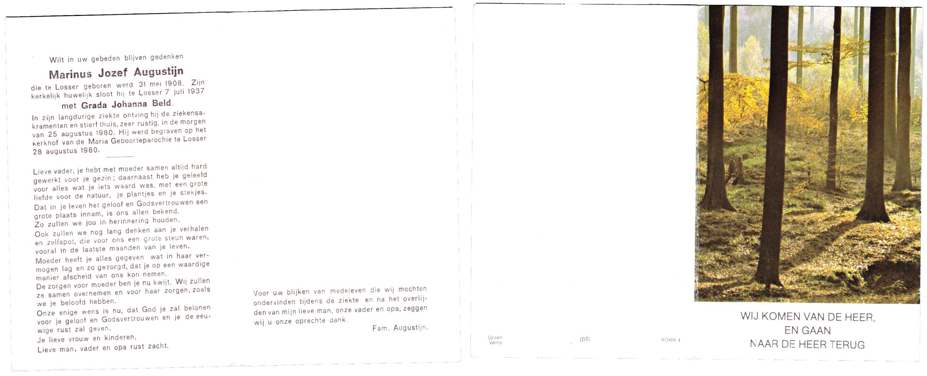 AUGUSTIJN, Marinus Jozef, geboren op 31-5-1908 te Losser, overleden op 25-8-1980 te Losser op 72-jarige leeftijd, begraven op 28-8-1980 te Losser.