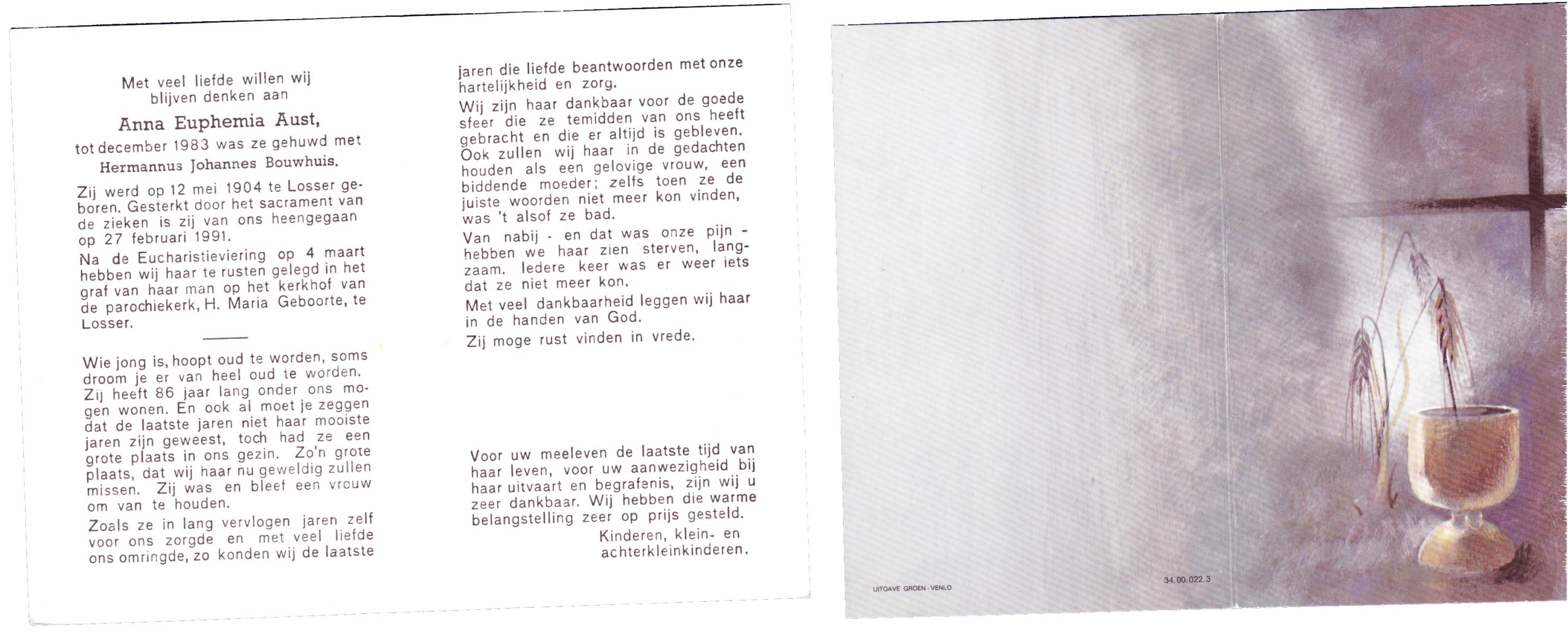 AUST, Anna Euphemia, geboren op 12-5-1904 te Losser, overleden op 27-2-1991 op 86-jarige leeftijd, begraven op 4-3-1991 te Losser.
