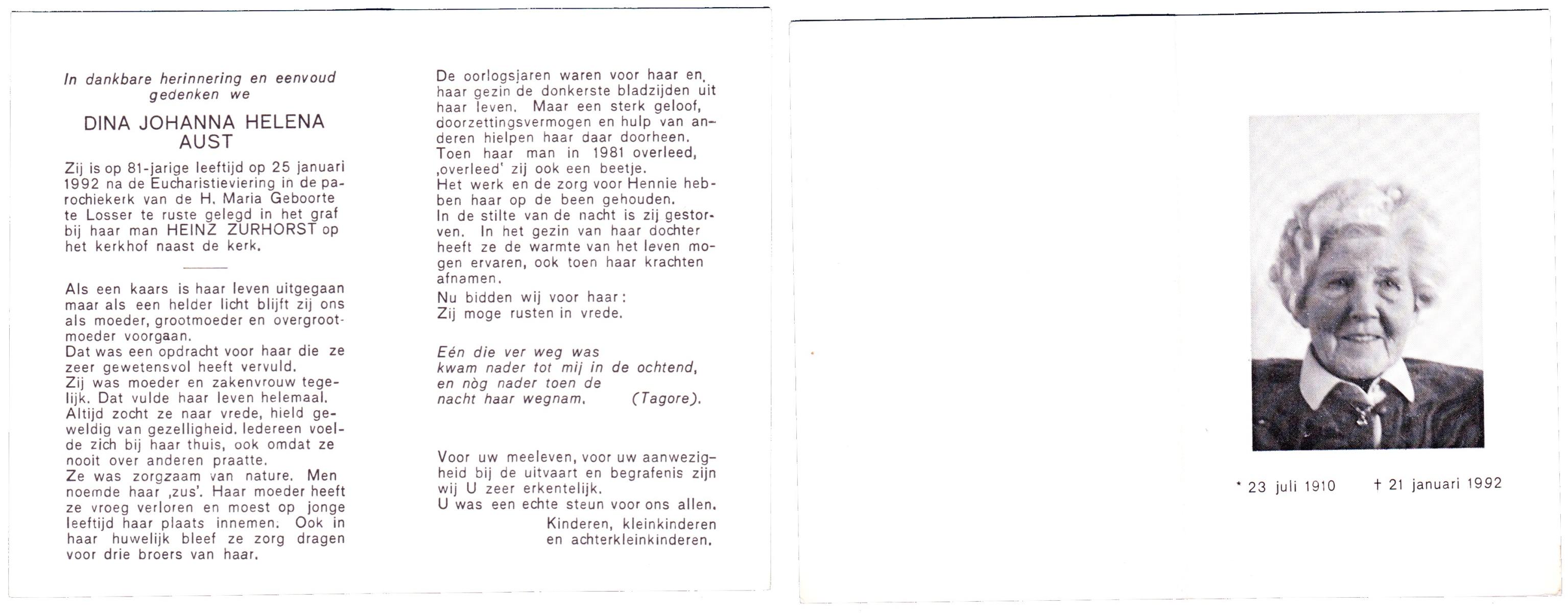 AUST, Dina Johanna Helena, geboren op 23-7-1910, overleden op 21-1-1992 op 81-jarige leeftijd, begraven op 25-1-1992 te Losser.
