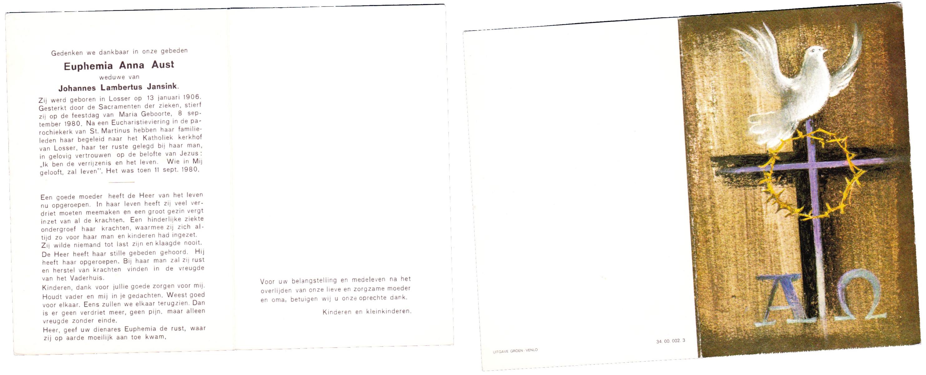AUST, Euphemia Anna, geboren op 13-1-1906 te Losser, overleden op 8-9-1980 te Losser op 74-jarige leeftijd, begraven op 11-9-1980 te Losser.
