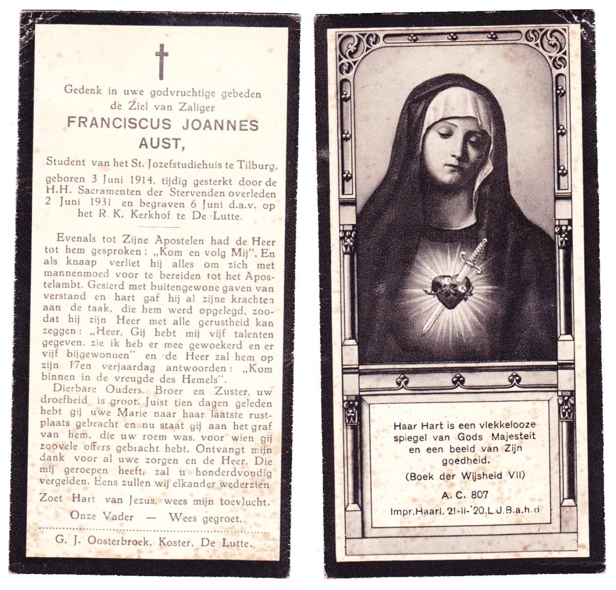 AUST, Franciscus Joannes, geboren op 3-6-1914, overleden op 2-6-1931 op 16-jarige leeftijd, begraven op 6-6-1931 te De Lutte.