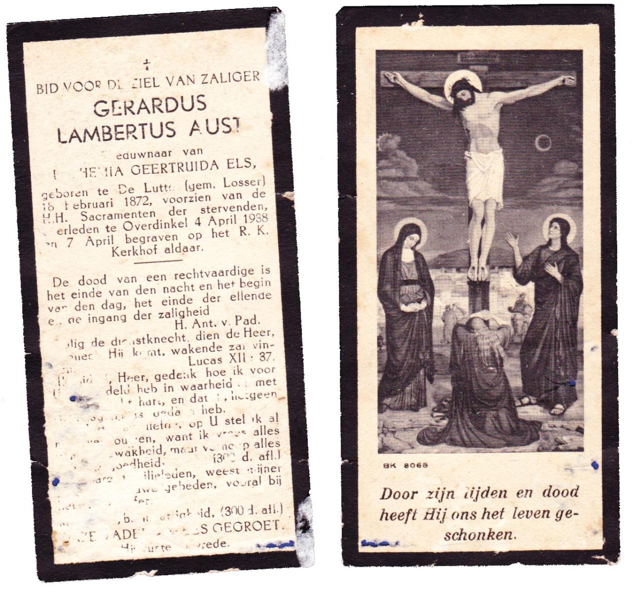 AUST, Gerardus Lambertus, geboren op 16-02-1872 te De Lutte, overleden op 4-4-1938 te Overdinkel op 66-jarige leeftijd, begraven op 7-4-1938 te Overdinkel.