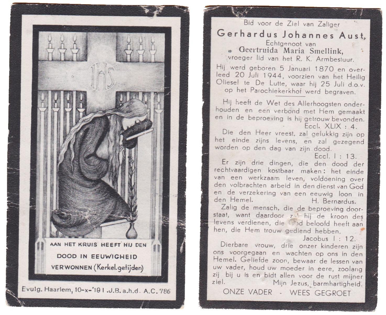 AUST, Gerhardus Johannes, geboren op 05-01-1870, overleden op 20-7-1944 te De Lutte op 74-jarige leeftijd, begraven op 25-7-1944 te De Lutte.