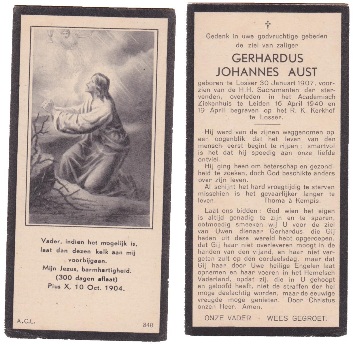 AUST, Gerhardus Johannes, geboren op 30-1-1907 te Losser, overleden op 16-4-1940 te Leiden op 33-jarige leeftijd, begraven op 19-4-1940 te Losser.