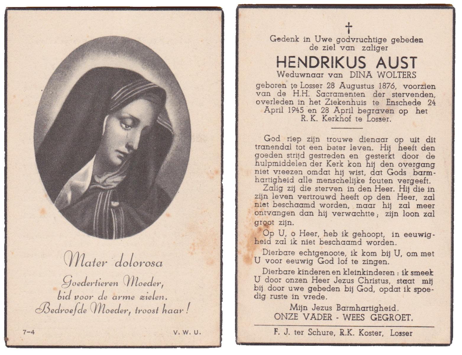 AUST, Hendrikus, geboren op 28-08-1876 te Losser, overleden op 24-4-1945 te Enschede op 68-jarige leeftijd, begraven op 28-4-1945 te Losser.