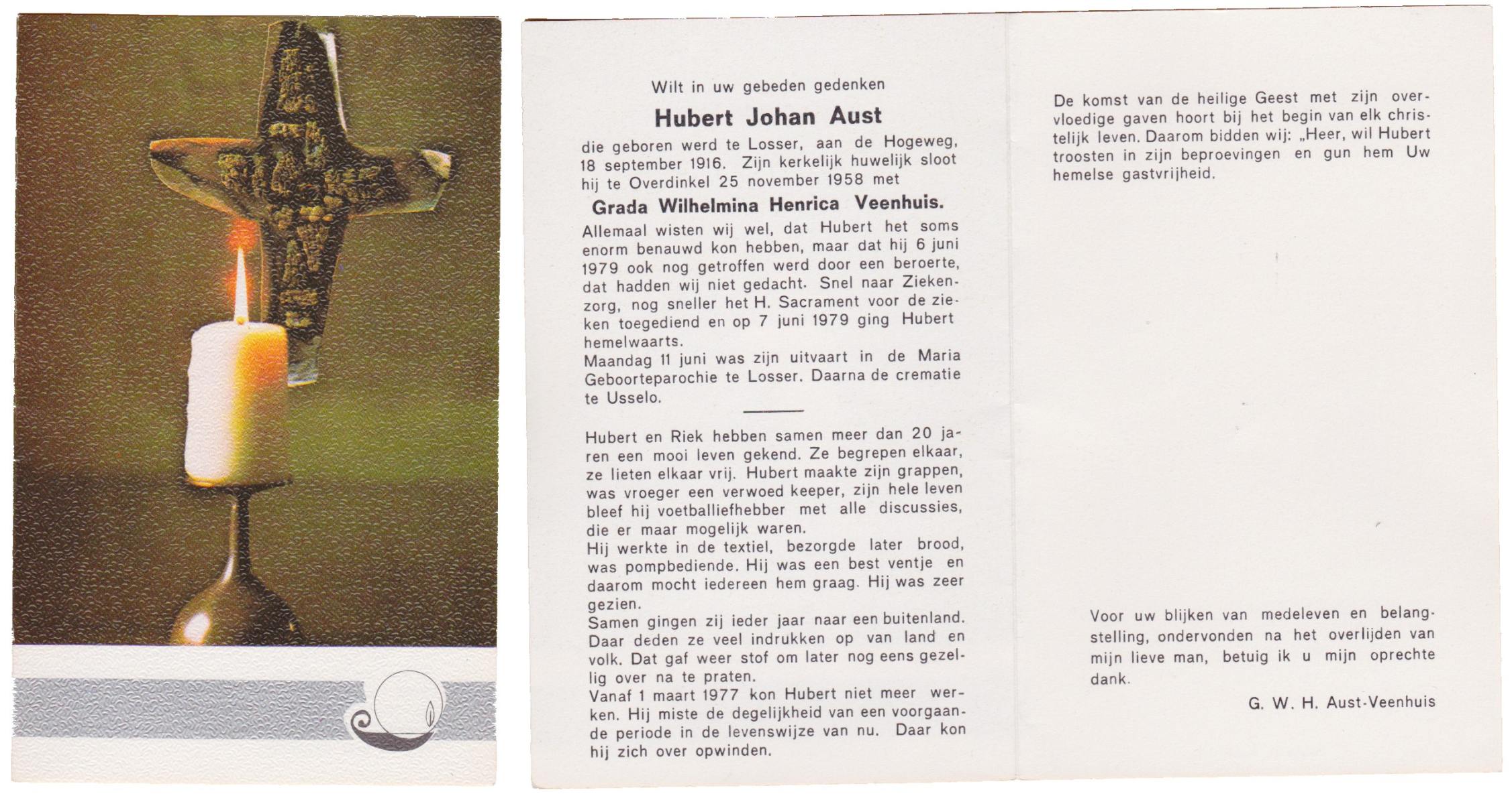 AUST, Hubert Johan, geboren op 18-9-1916 te Losser, overleden op 7-6-1979 te Enschede op 63-jarige leeftijd, begraven op 11-6-1979 te Losser.