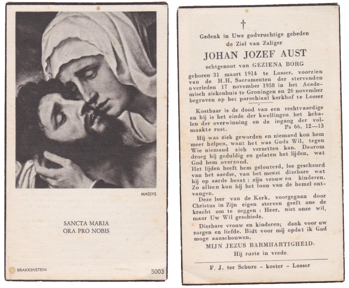 AUST, Johan Jozef, geboren op 31-3-1914 te Losser, overleden op 17-11-1958 te Groningen op 44-jarige leeftijd, begraven op 20-11-1958 te Losser.