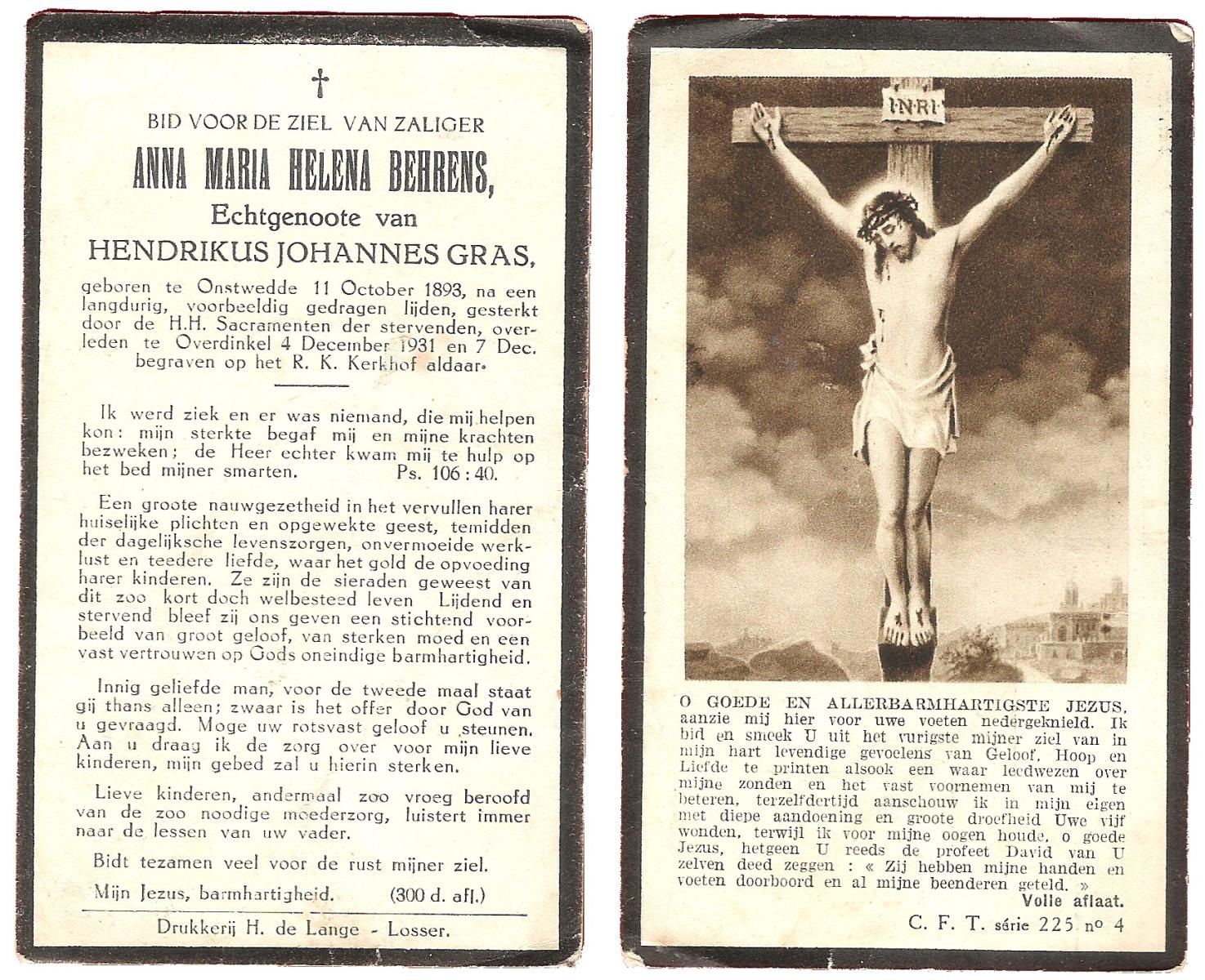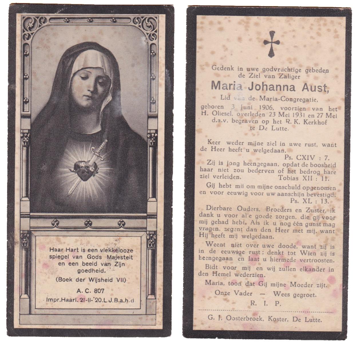 AUST, Maria Johanna, geboren op 3-6-1906, overleden op 23-5-1931 op 24-jarige leeftijd, begraven op 27-5-1931 te De Lutte.