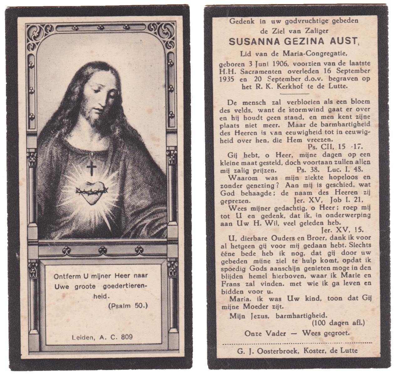 AUST, Susanna Gezina, geboren op 3-6-1906, overleden op 16-9-1935 op 29-jarige leeftijd, begraven op 20-9-1935 te De Lutte.