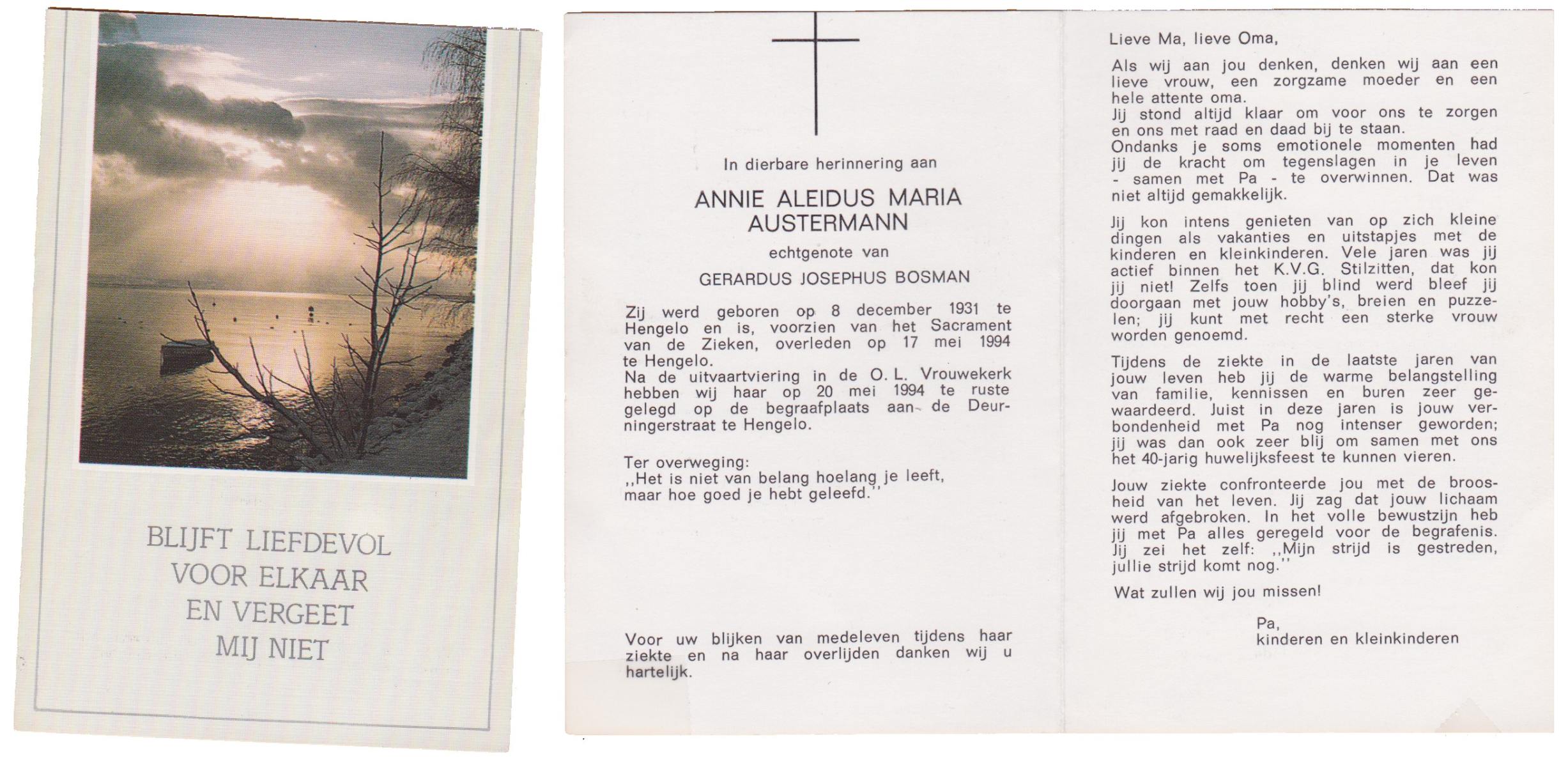 AUSTERMANN, Annie Aleidus Maria, geboren op 8-12-1931 te Hengelo (O), overleden op 17-5-1994 te Hengelo (Ov.) op 62-jarige leeftijd, begraven op 20-5-1994 te Hengelo (Ov.).