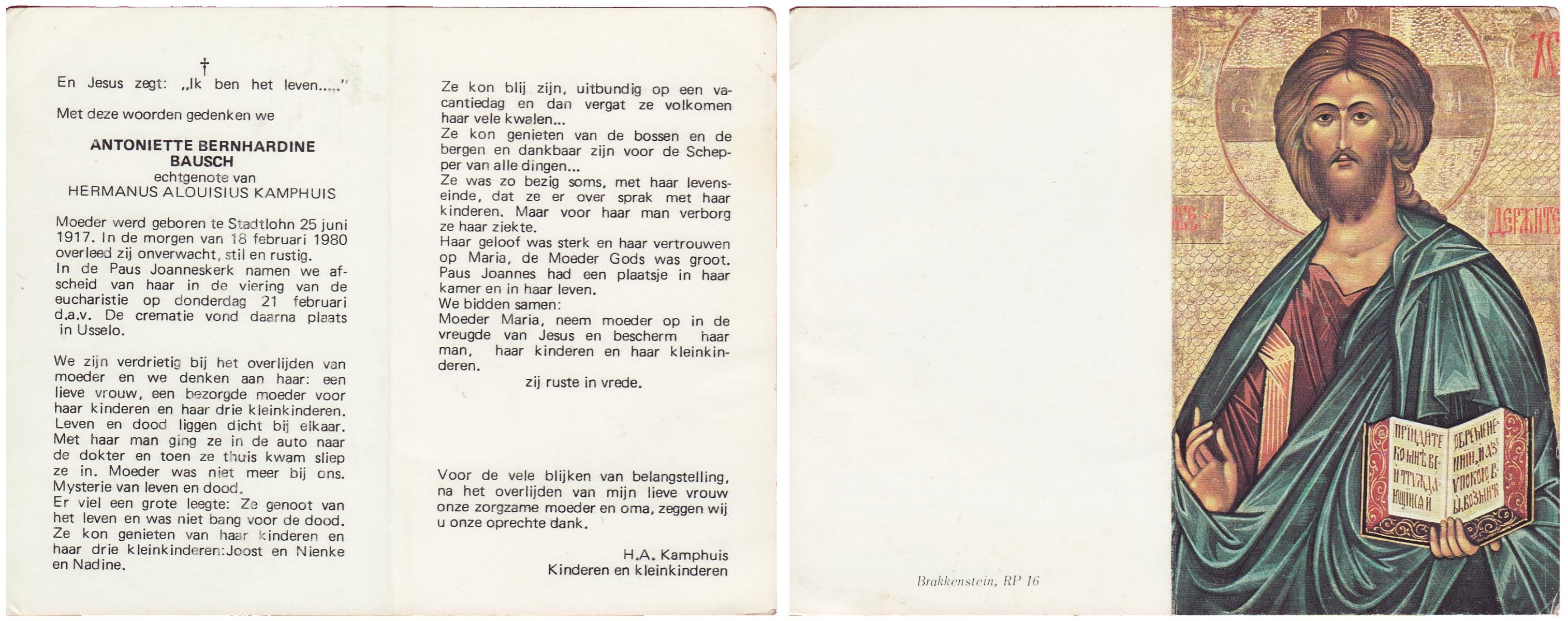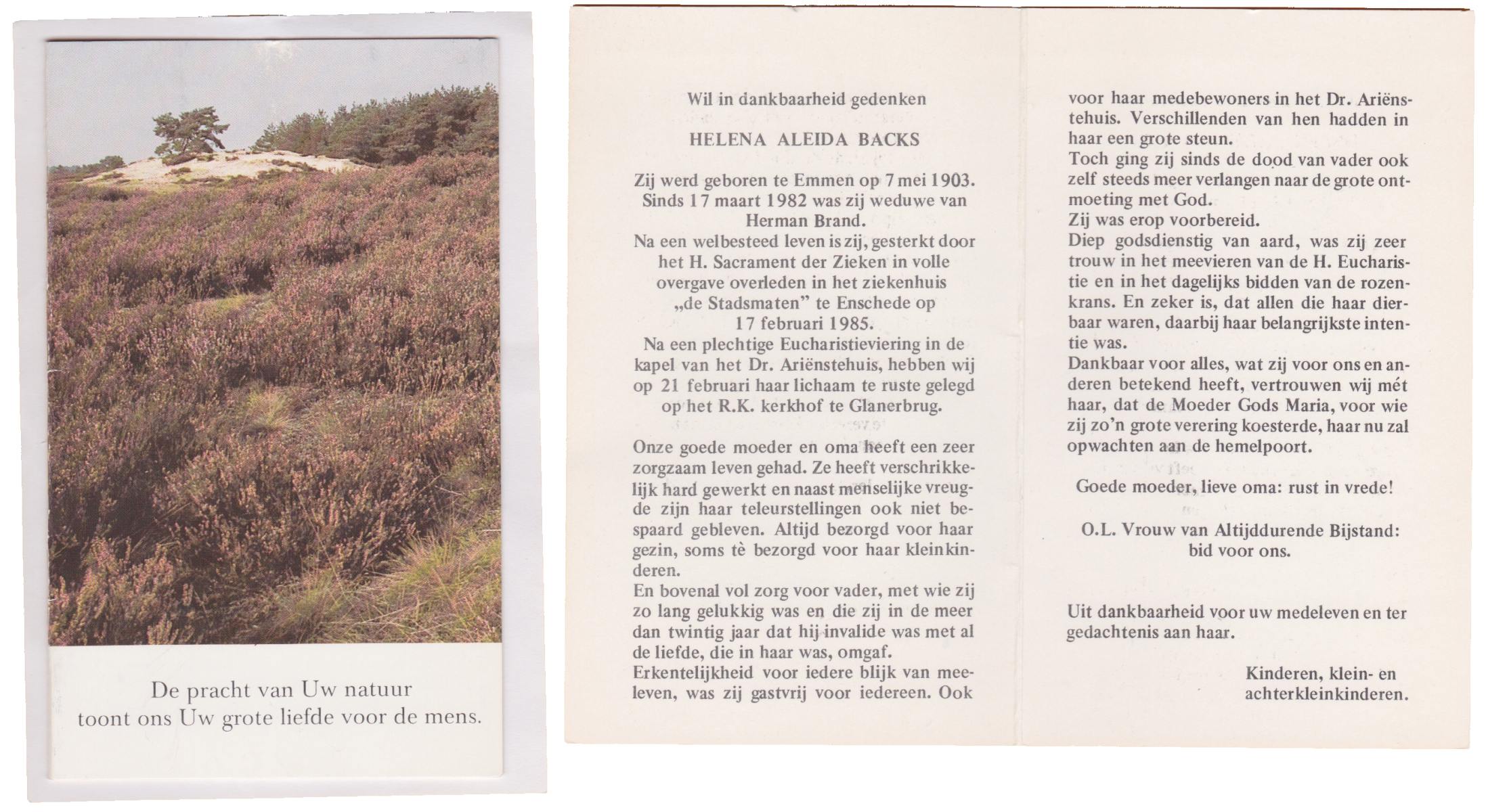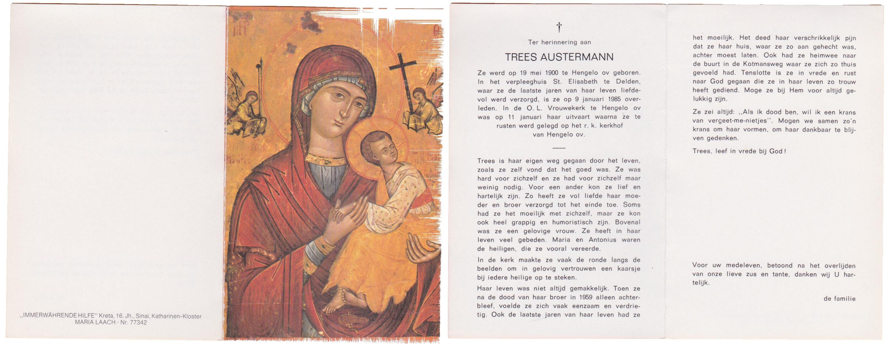 AUSTERMANN, Trees, geboren op 19-5-1900 te Hengelo (O), overleden op 9-1-1985 te Delden op 84-jarige leeftijd, begraven op 11-1-1985 te Hengelo (Ov.).