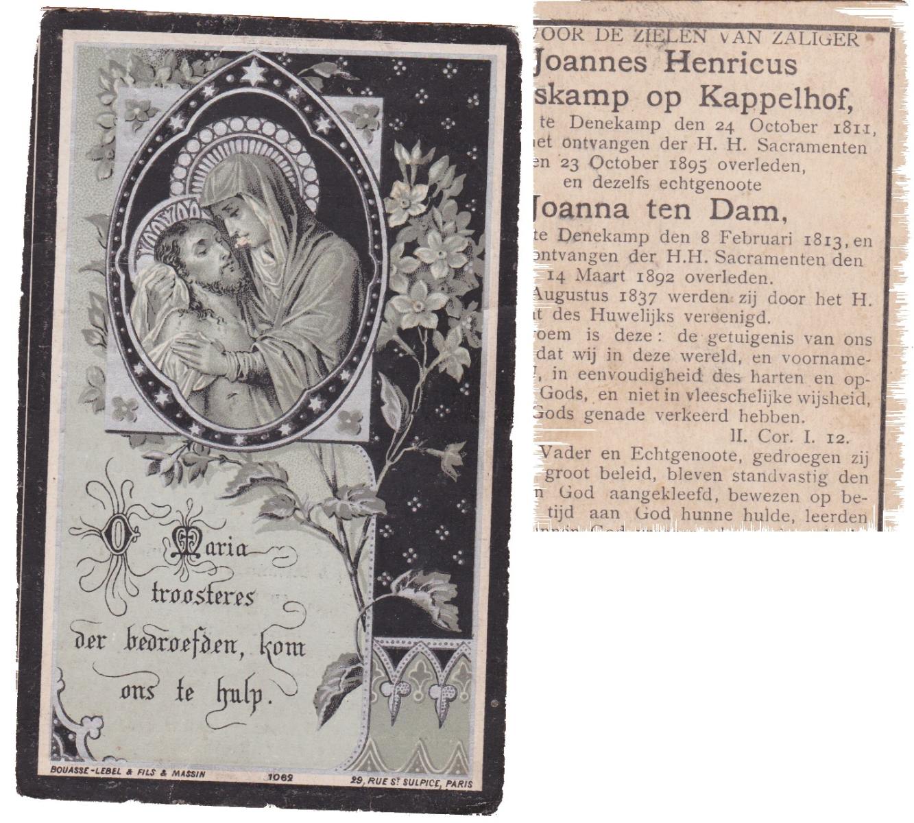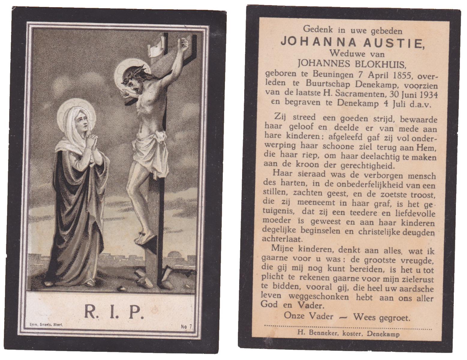 AUSTIE, Johanna, geboren op 07-04-1855 te Beuningen (Ov.), overleden op 30-6-1934 te Denekamp op 79-jarige leeftijd, begraven op 4-7-1934 te Denekamp.