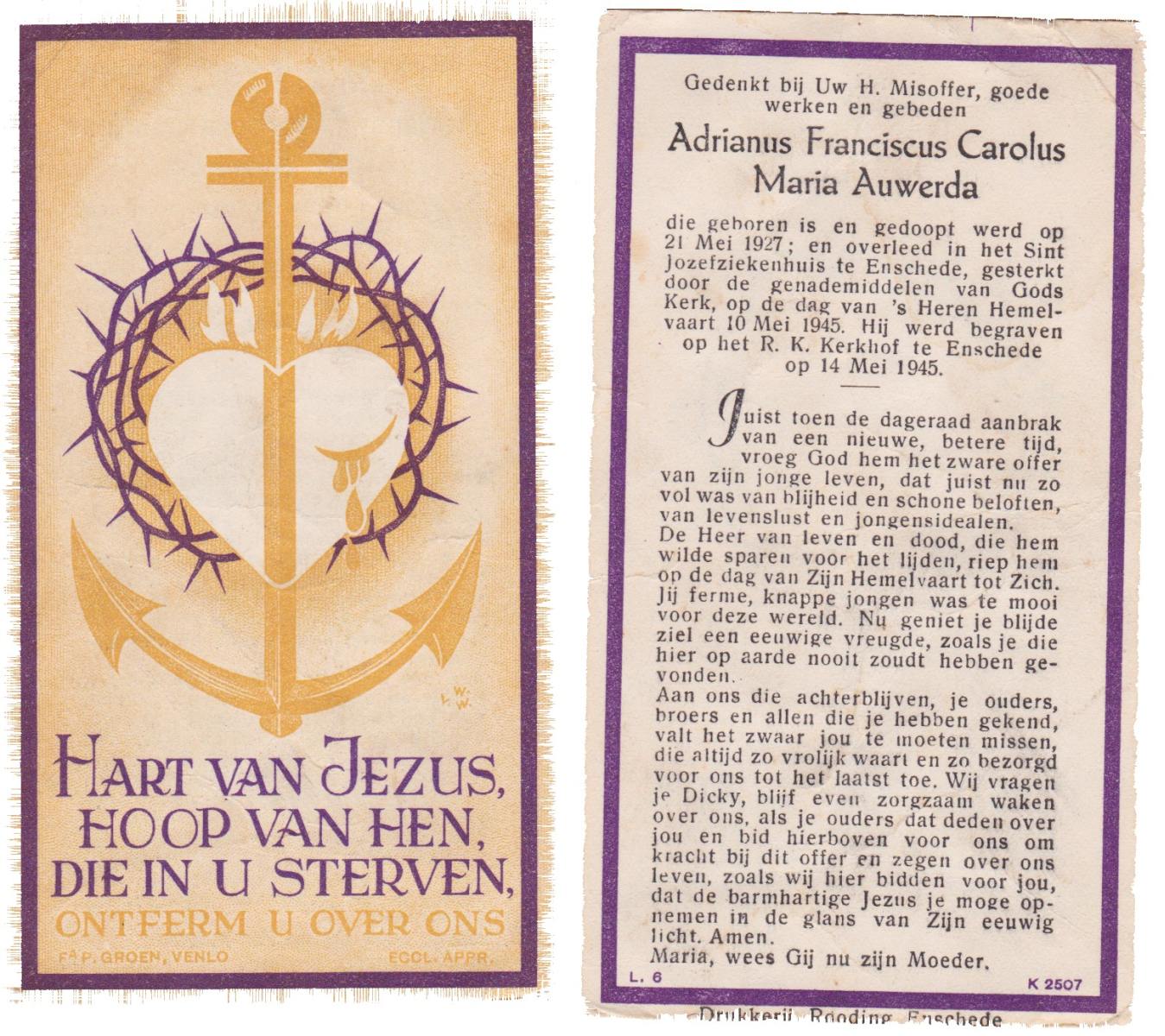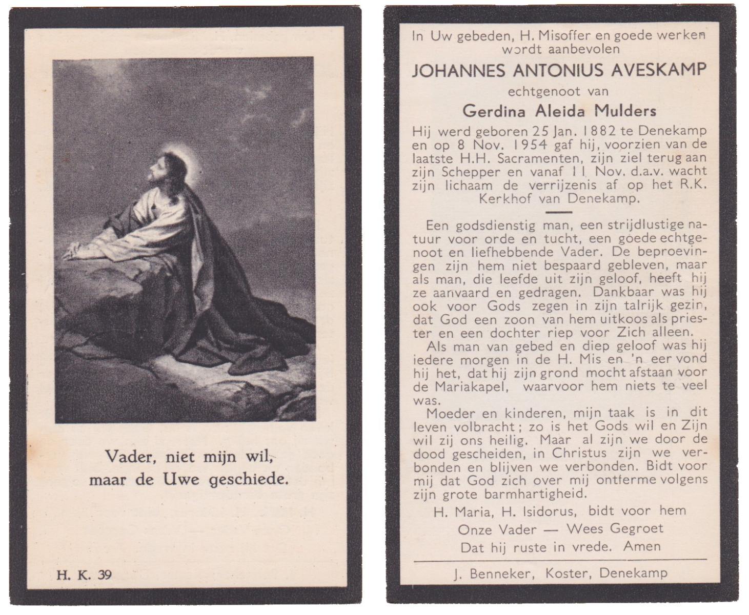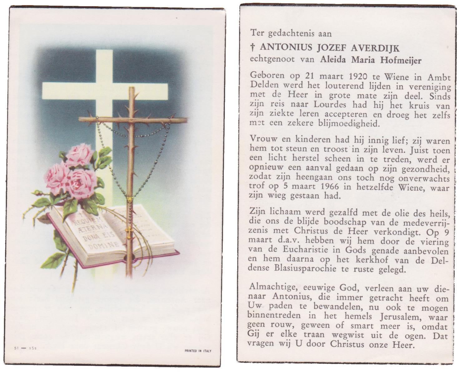 AVERDIJK, Antonius Jozef, geboren op 21-3-1920 te Wiene, overleden op 5-3-1966 te Wiene op 45-jarige leeftijd, begraven op 9-3-1966 te Delden.