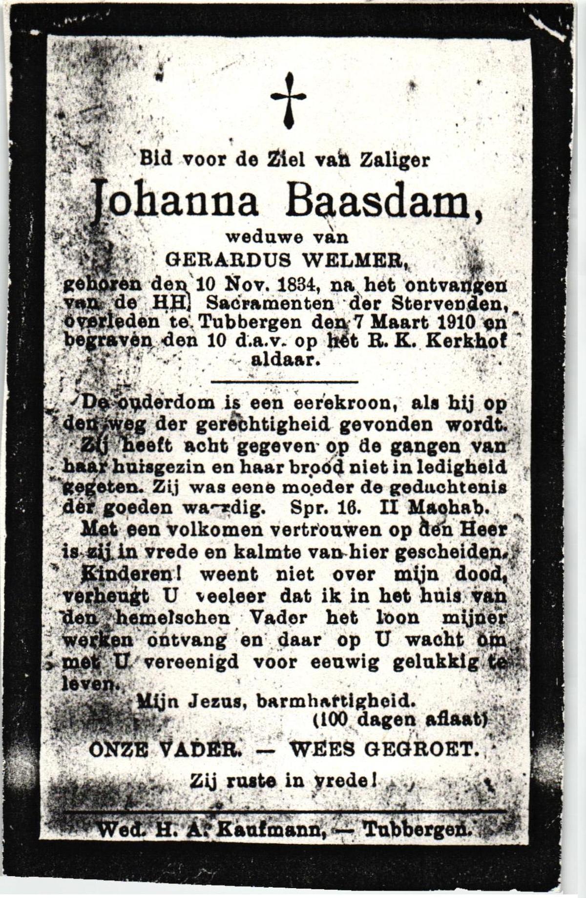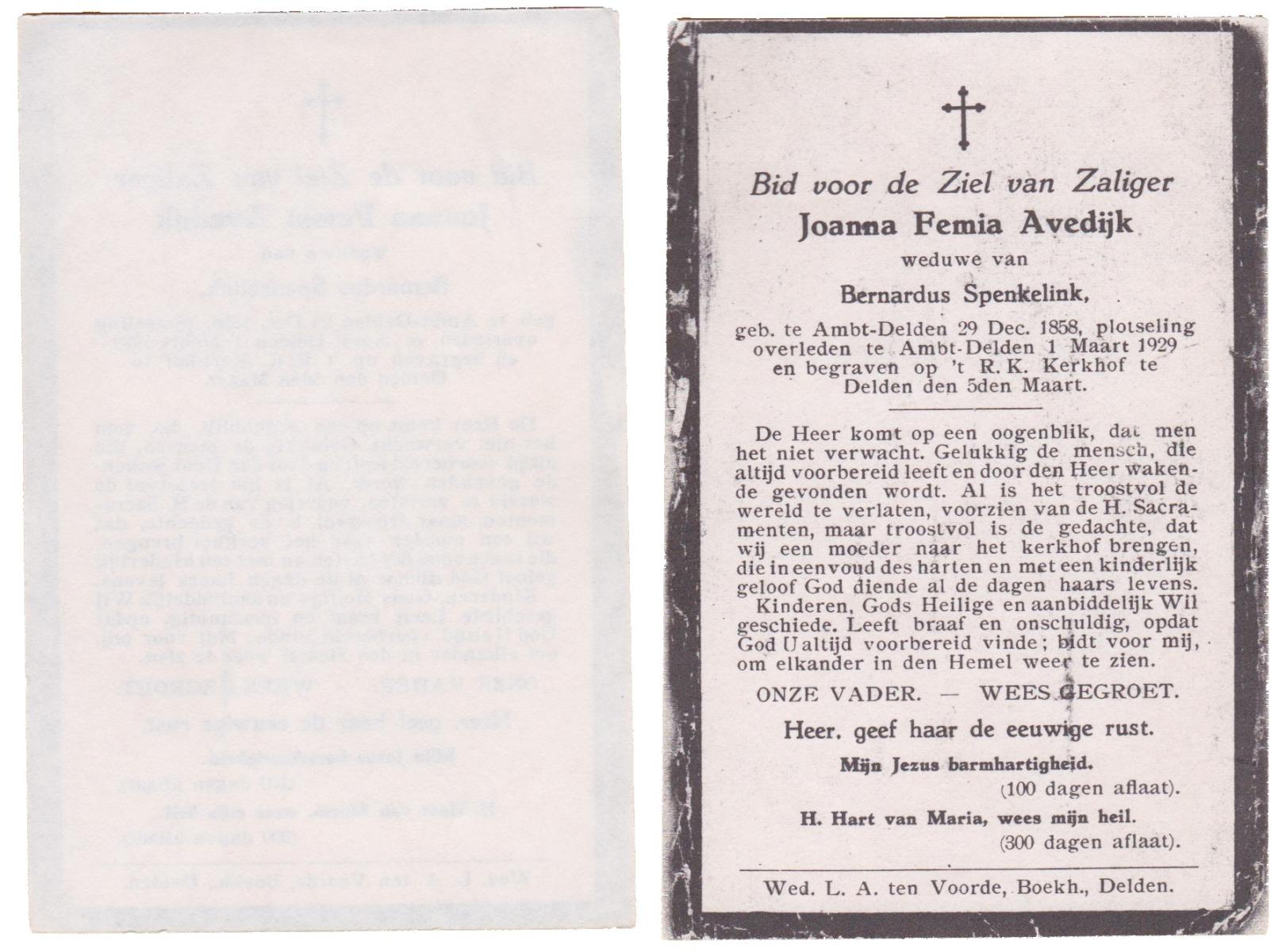 AVEDIJK, Joanna Femia, geboren op 29-12-1858 te Delden, Ambt, overleden op 1-3-1929 te Delden, Ambt op 70-jarige leeftijd, begraven op 5-3-1929 te Delden.