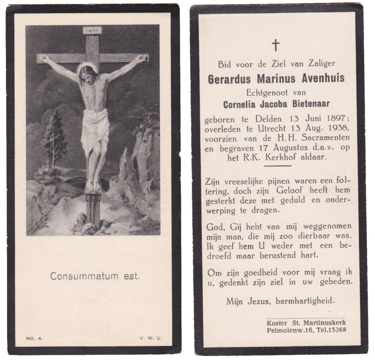 AVENHUIS, Gerardus Marinus, geboren op 13-06-1897 te Delden, overleden op 13-8-1938 te Utrecht op 41-jarige leeftijd, begraven op 17-8-1938 te Utrecht.