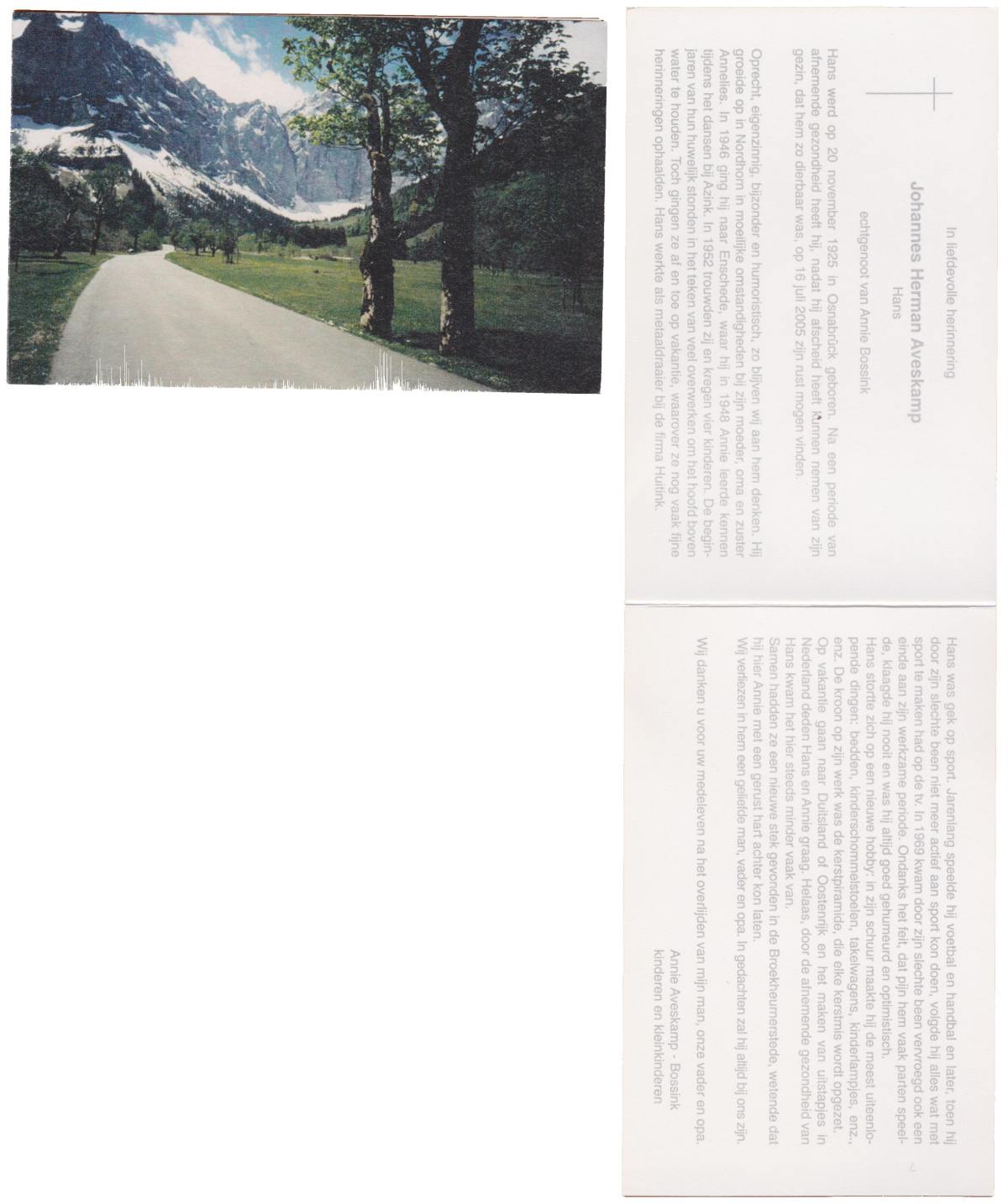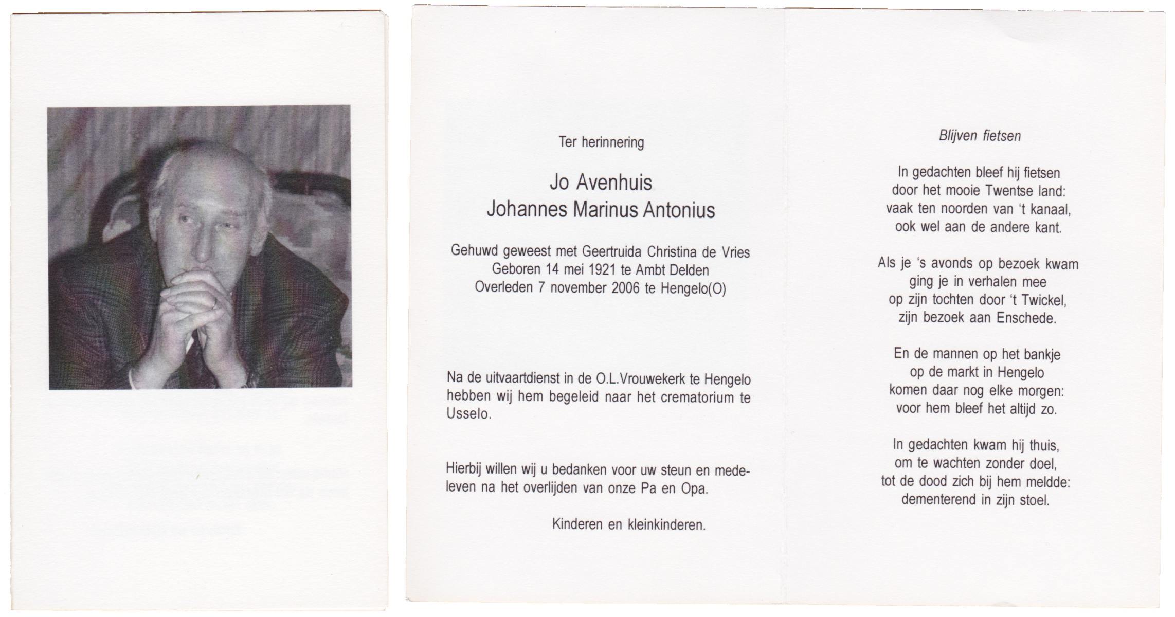 AVENHUIS, Jo (Johannes Marinus Antonius, geboren op 14-5-1921 te Delden, Ambt, overleden op 7-11-2006 te Hengelo (Ov.) op 85-jarige leeftijd, gecremeerd te Usselo.