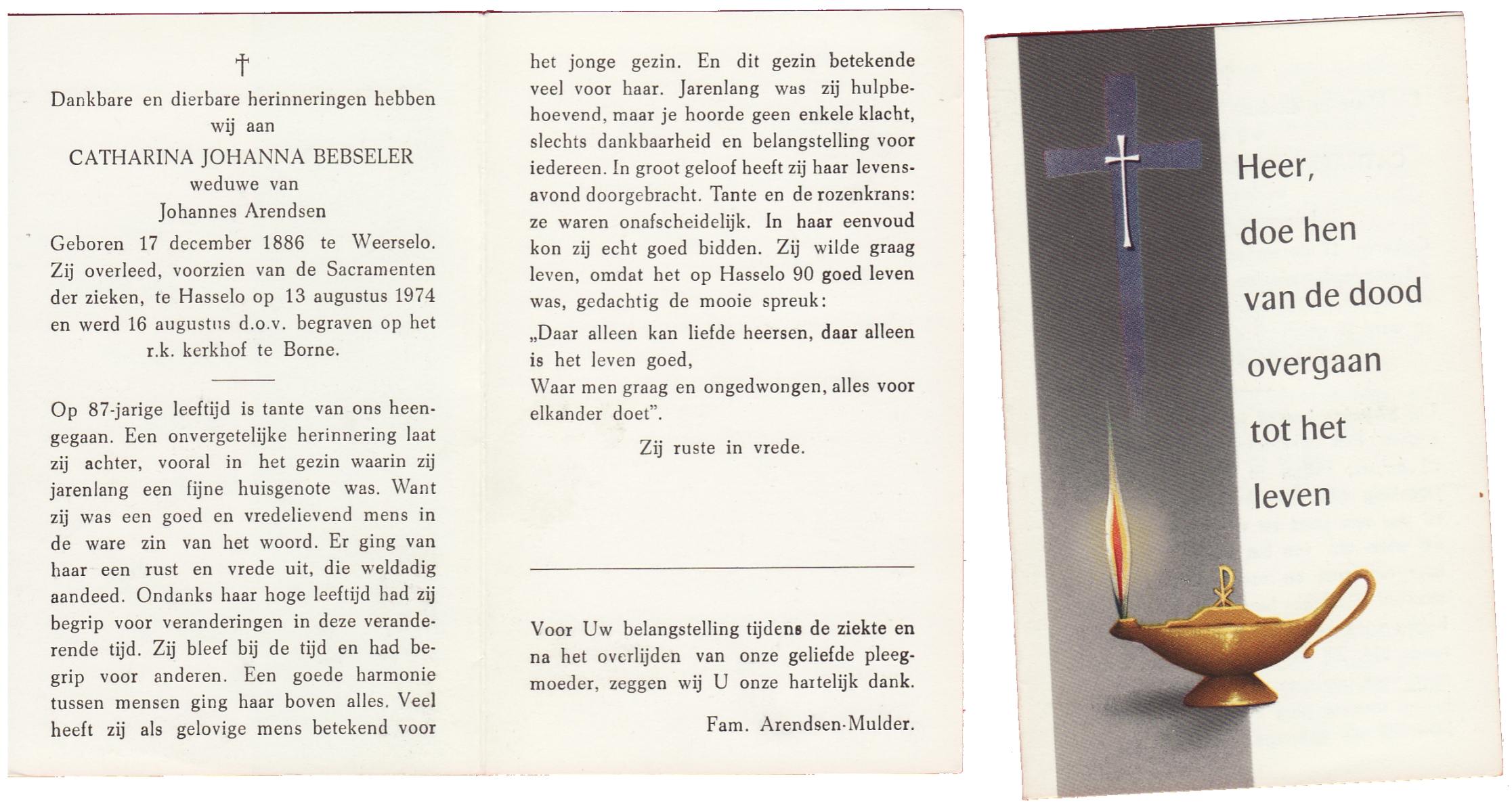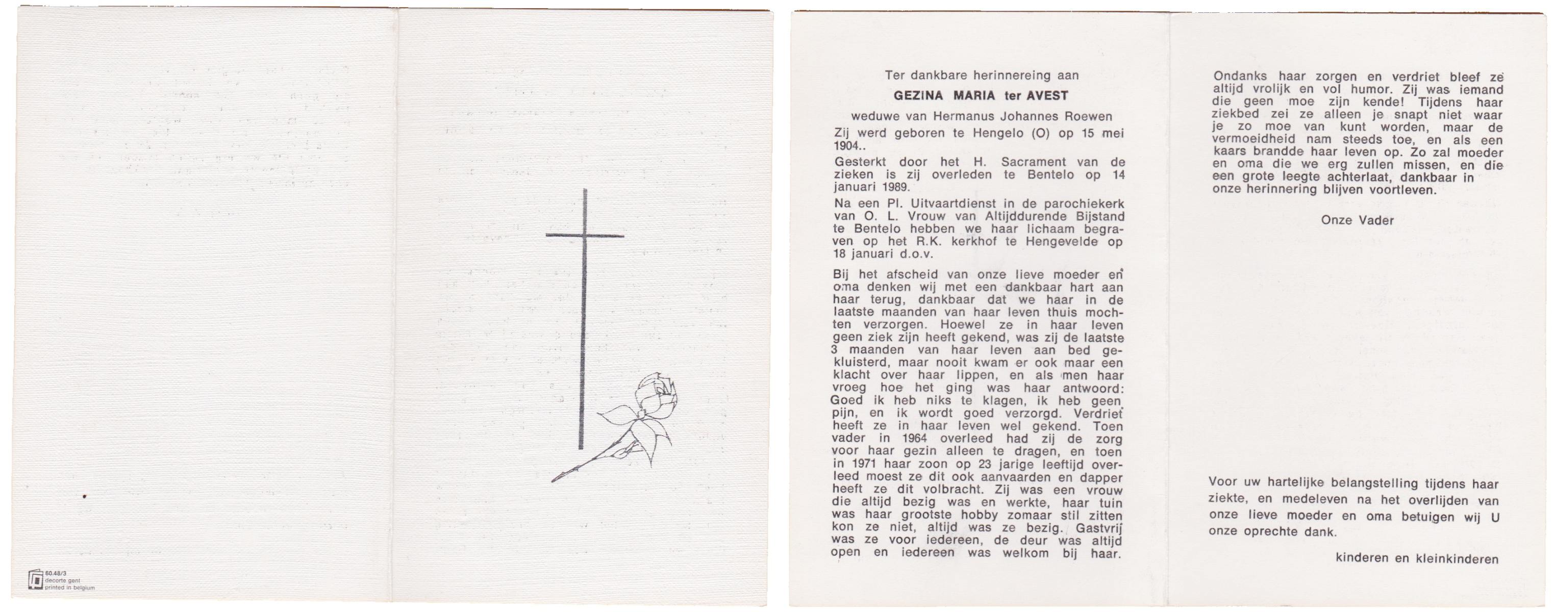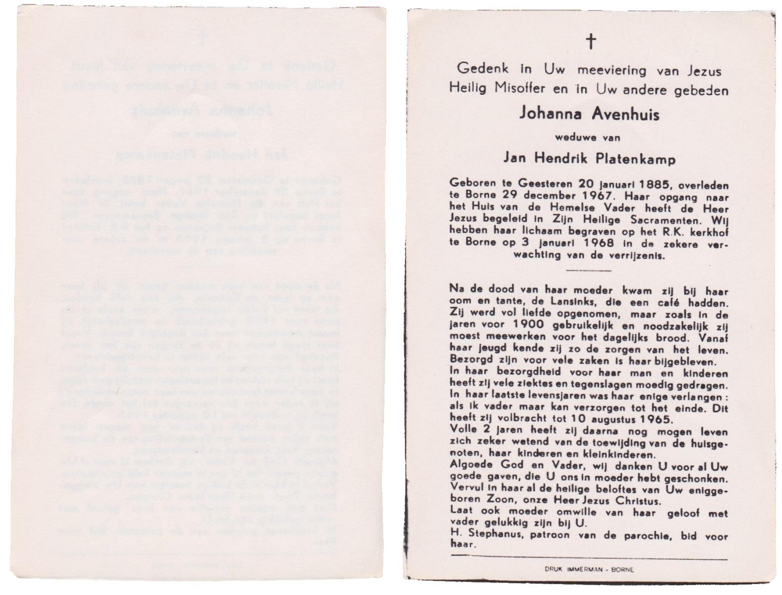 AVENHUIS, Johanna, geboren op 20-01-1885 te Geesteren (Ov.), overleden op 29-12-1967 te Borne op 82-jarige leeftijd, begraven op 3-1-1968 te Borne, RK Kerkhof.