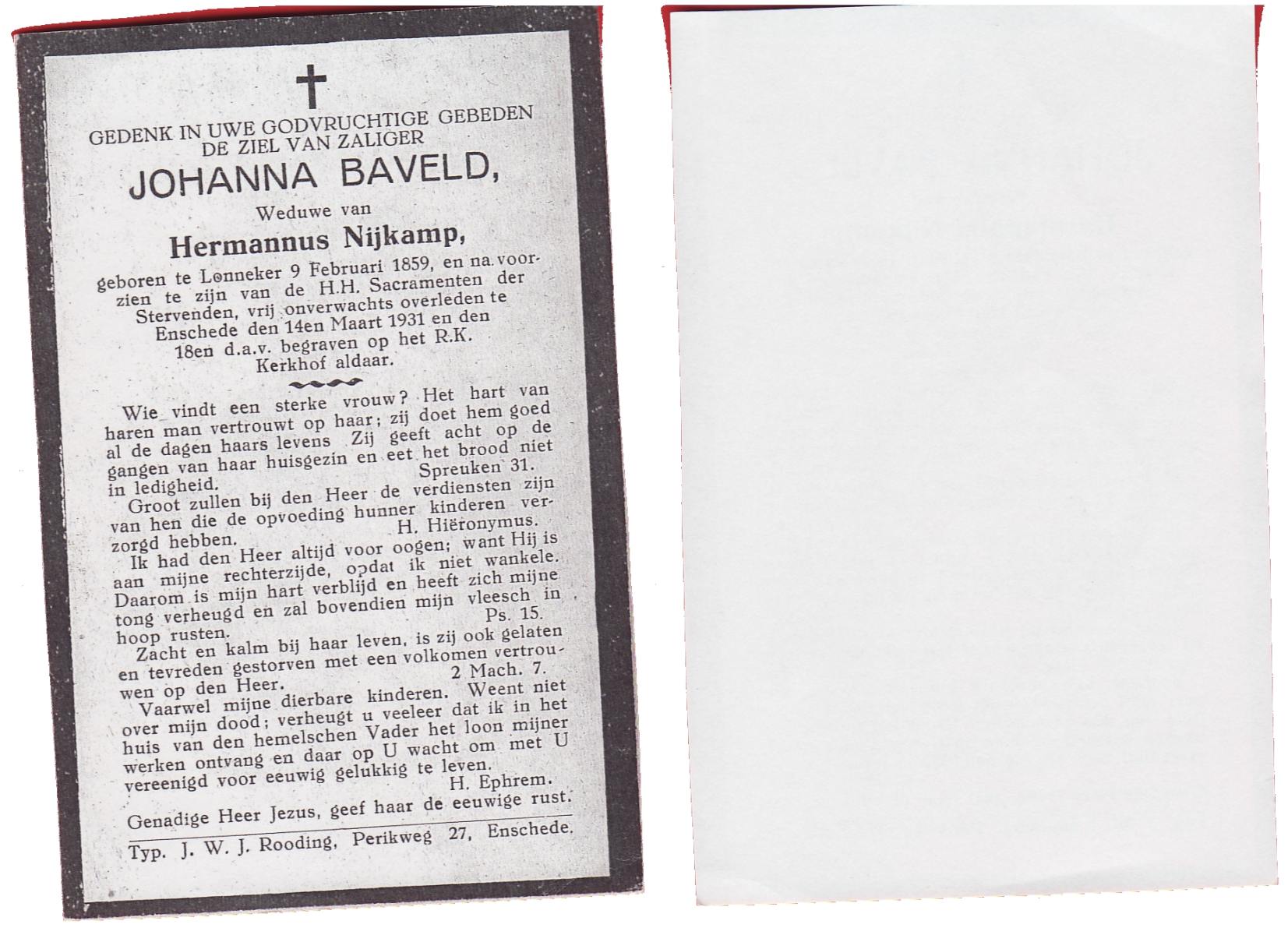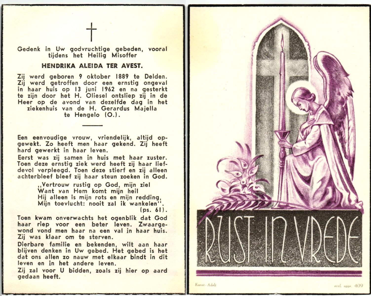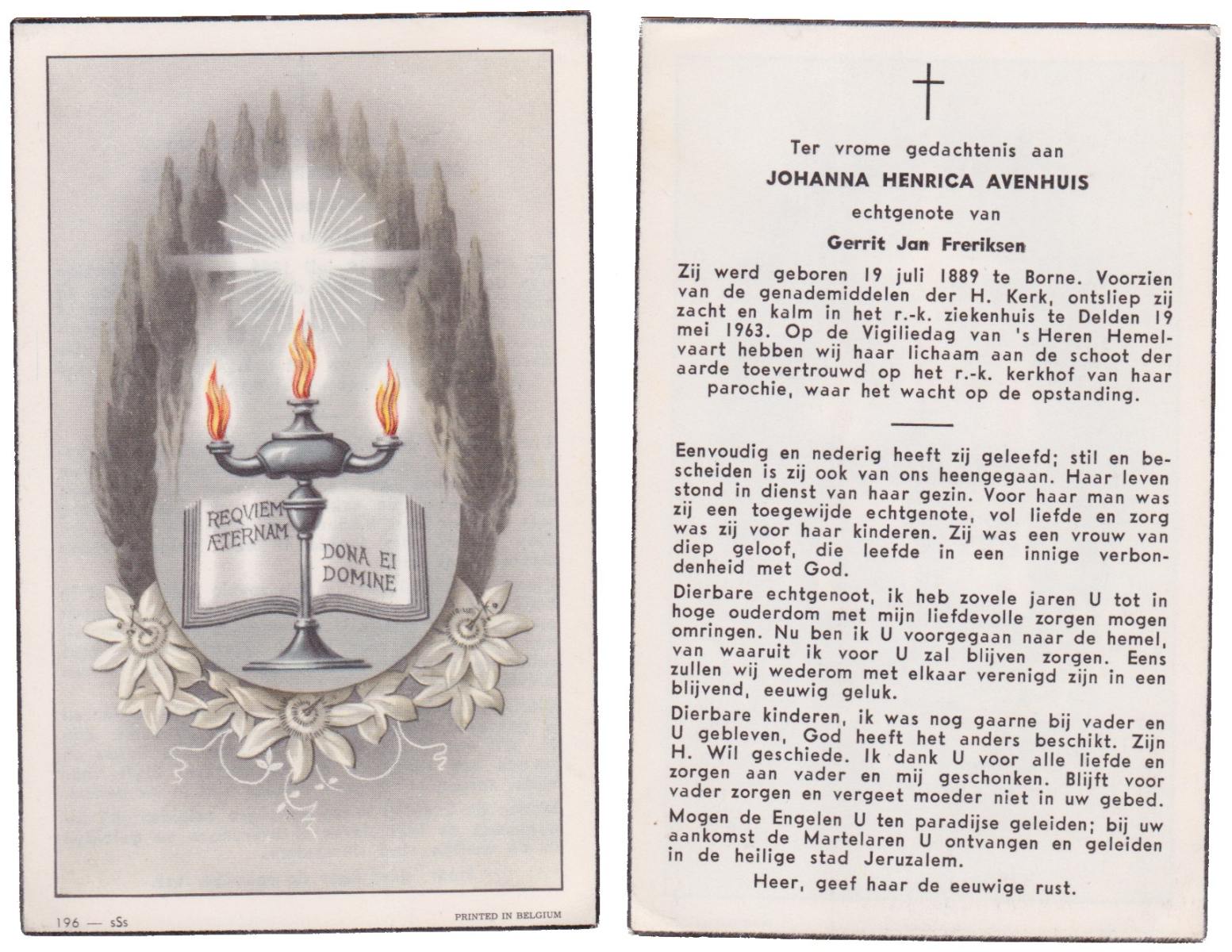 AVENHUIS, Johanna Henrica, geboren op 19-07-1889 te Borne, overleden op 19-5-1963 te Delden op 73-jarige leeftijd.