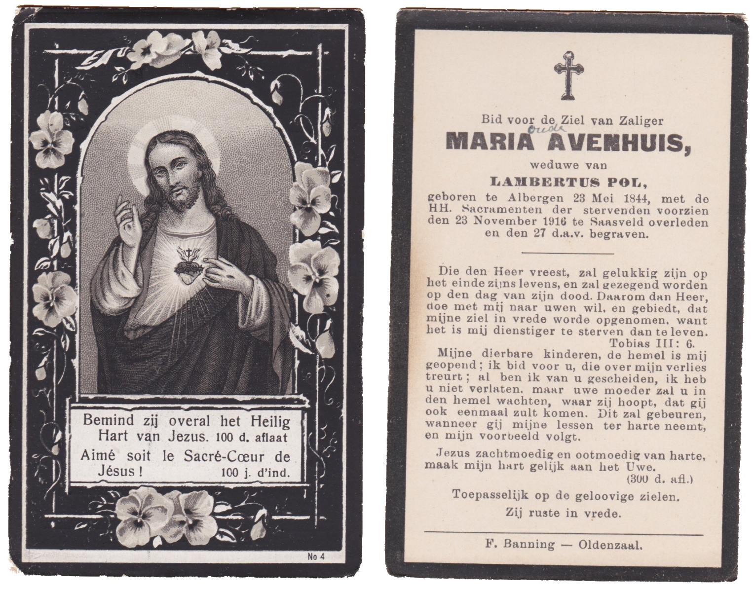 AVENHUIS, Maria, geboren op 23-05-1844 te Albergen, overleden op 23-11-1916 te Saasveld op 72-jarige leeftijd, begraven op 27-11-1916 te Saasveld.