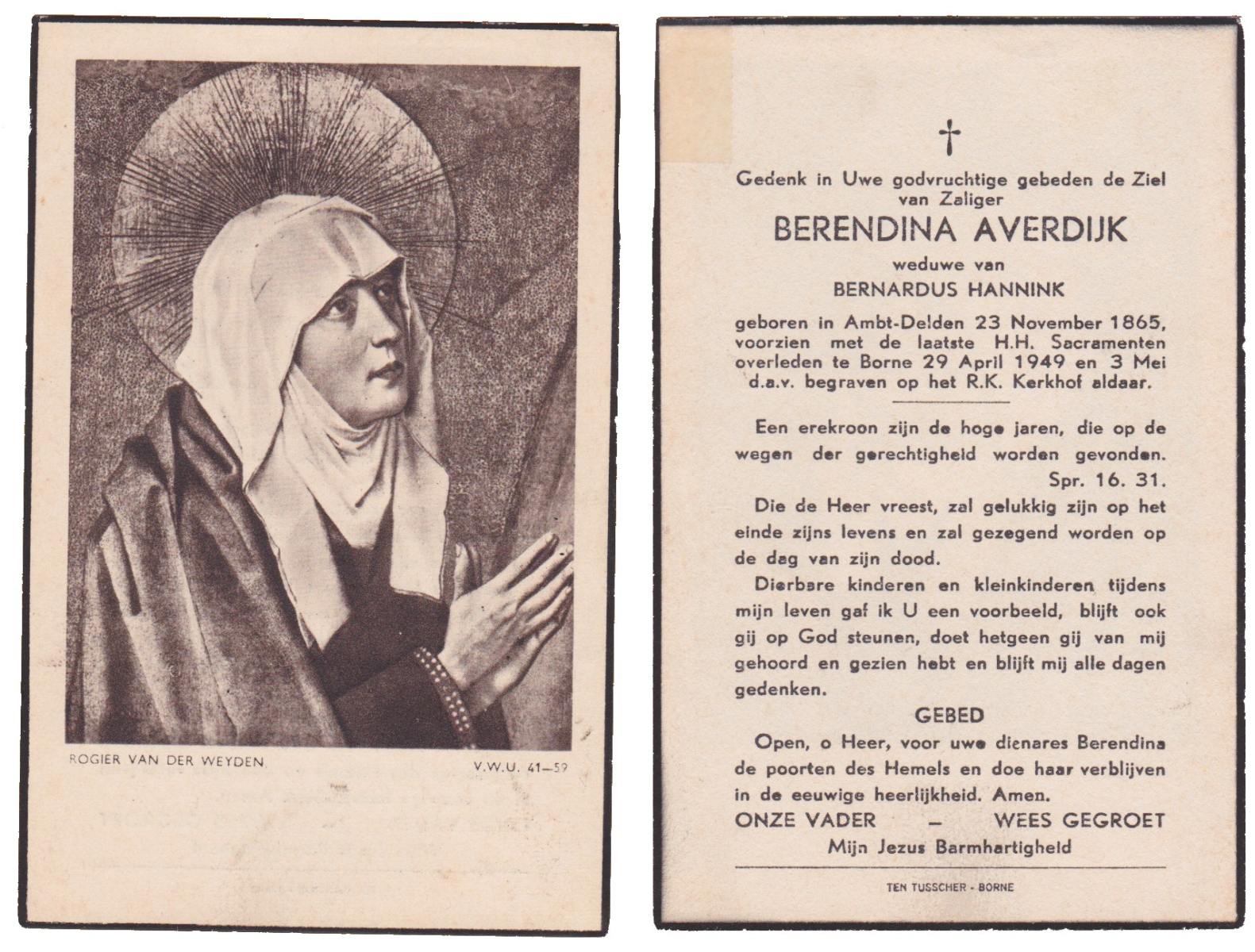 AVERDIJK, Berendina, geboren op 23-11-1865 te Delden, Ambt, overleden op 29-4-1949 te Borne op 83-jarige leeftijd, begraven op 3-5-1949 te Borne.